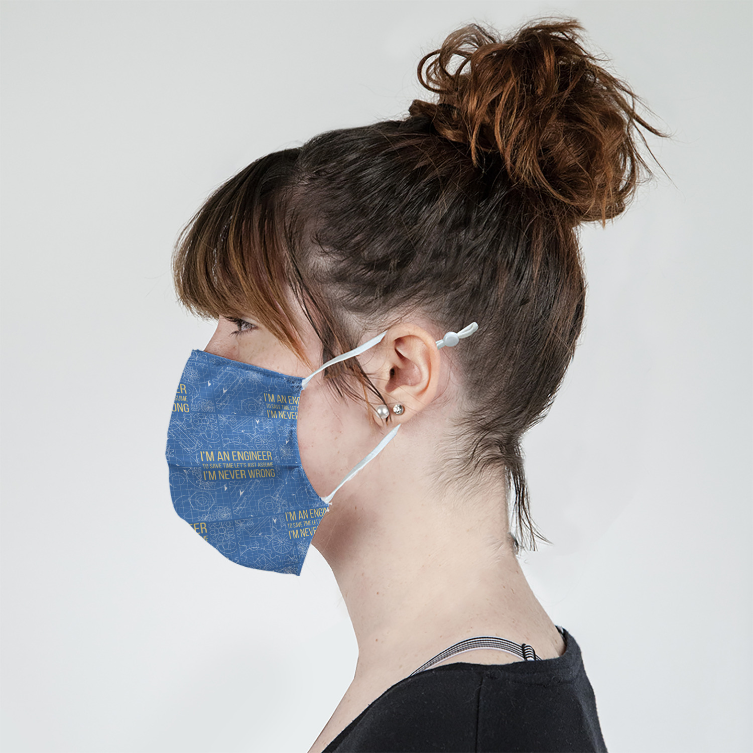 These fun face masks are 7" wide and 3.5" high. They feature pleats, adjustable ear loops, and are made with two layers of fabric. The top layer where your design is printed is a breathable polyester sheeting, while the inside layer is a soft microfiber polyester