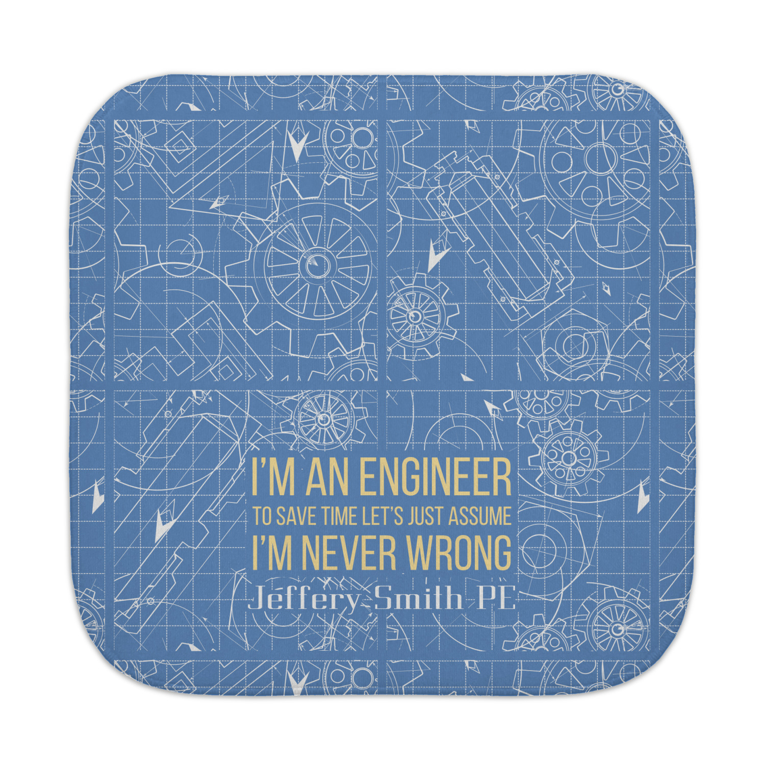 The main focus of this design is a funny quote that says "I'm an engineer, to save time let's just assume I'm never wrong." This will be sure to get anyone to crack a smile. The background is a blueprint pattern with gears and other shapes. The main colors are blue and light yellow. Your personalization goes directly under the quote.