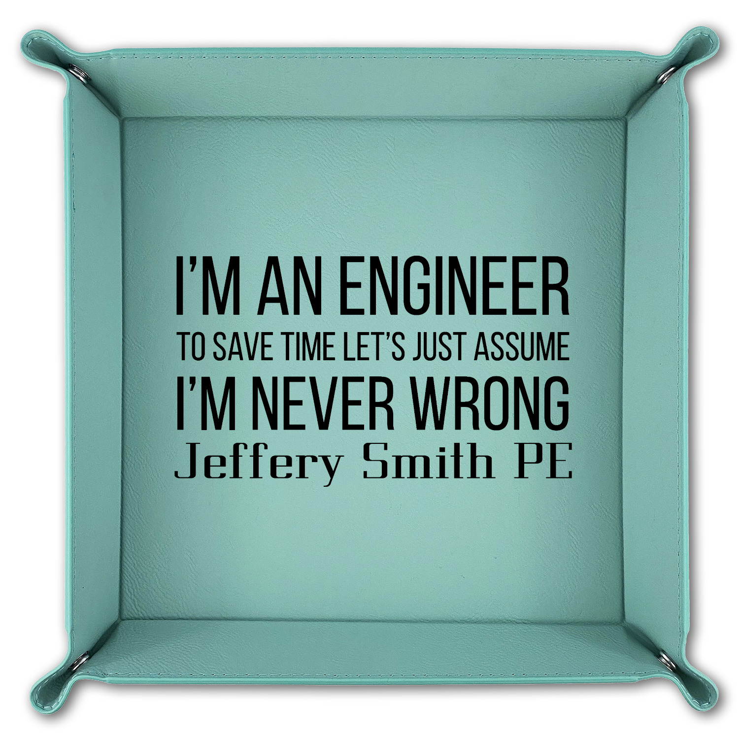 The main focus of this design is a funny quote that says "I'm an engineer, to save time let's just assume I'm never wrong." This will be sure to get anyone to crack a smile. The background is a blueprint pattern with gears and other shapes. The main colors are blue and light yellow. Your personalization goes directly under the quote.