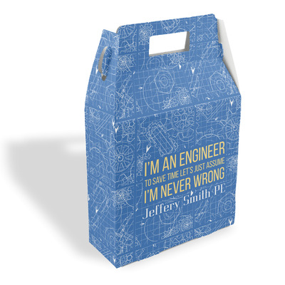 The main focus of this design is a funny quote that says "I'm an engineer, to save time let's just assume I'm never wrong." This will be sure to get anyone to crack a smile. The background is a blueprint pattern with gears and other shapes. The main colors are blue and light yellow. Your personalization goes directly under the quote.