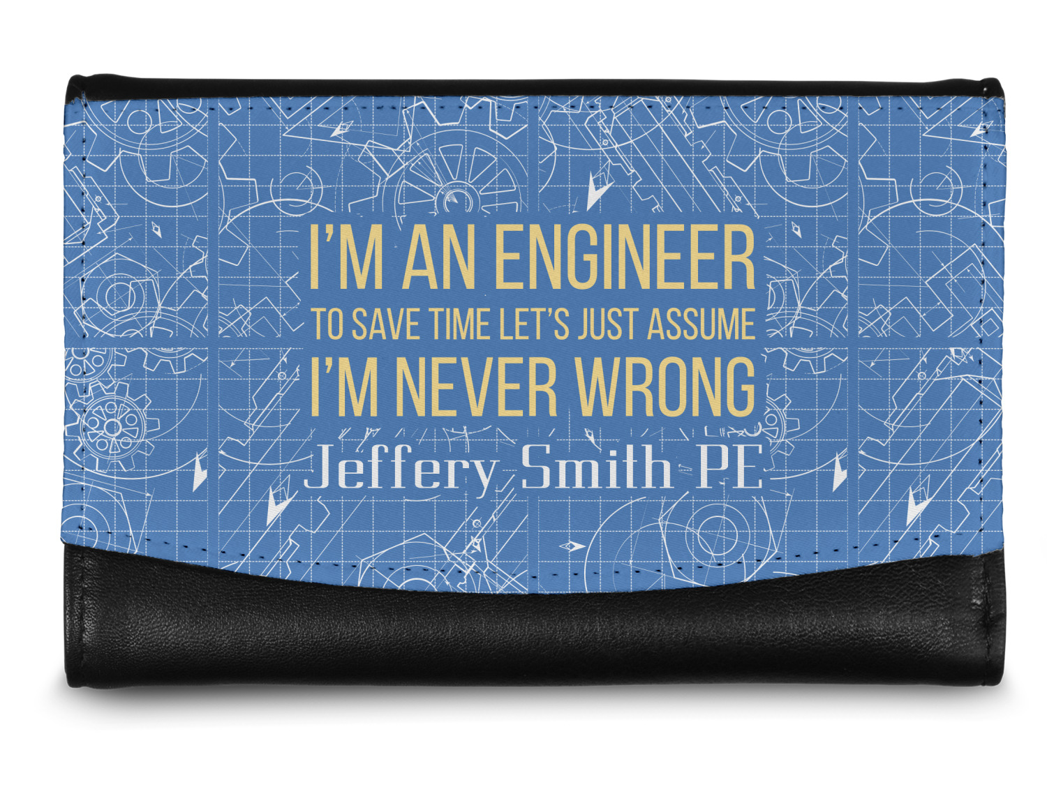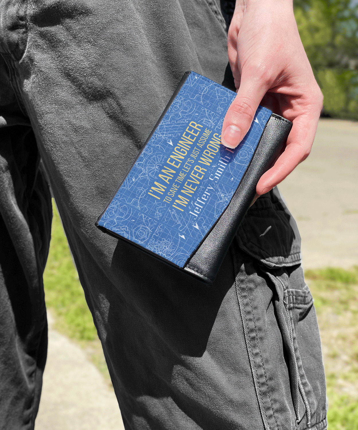 The main focus of this design is a funny quote that says "I'm an engineer, to save time let's just assume I'm never wrong." This will be sure to get anyone to crack a smile. The background is a blueprint pattern with gears and other shapes. The main colors are blue and light yellow. Your personalization goes directly under the quote.