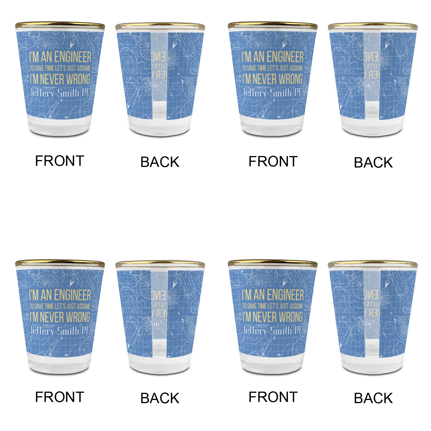 The main focus of this design is a funny quote that says "I'm an engineer, to save time let's just assume I'm never wrong." This will be sure to get anyone to crack a smile. The background is a blueprint pattern with gears and other shapes. The main colors are blue and light yellow. Your personalization goes directly under the quote.