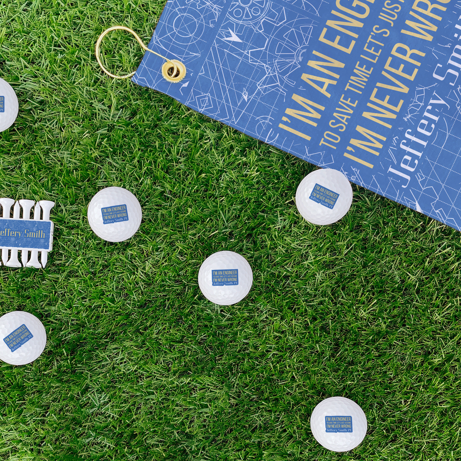 The main focus of this design is a funny quote that says "I'm an engineer, to save time let's just assume I'm never wrong." This will be sure to get anyone to crack a smile. The background is a blueprint pattern with gears and other shapes. The main colors are blue and light yellow. Your personalization goes directly under the quote.
