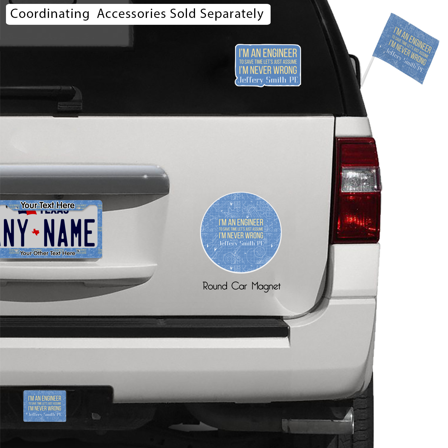 The main focus of this design is a funny quote that says "I'm an engineer, to save time let's just assume I'm never wrong." This will be sure to get anyone to crack a smile. The background is a blueprint pattern with gears and other shapes. The main colors are blue and light yellow. Your personalization goes directly under the quote.