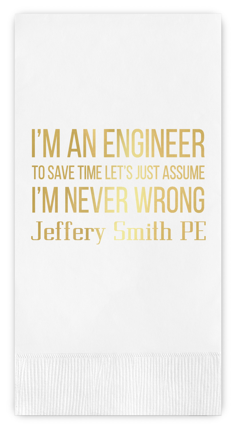 The main focus of this design is a funny quote that says "I'm an engineer, to save time let's just assume I'm never wrong." This will be sure to get anyone to crack a smile. The background is a blueprint pattern with gears and other shapes. The main colors are blue and light yellow. Your personalization goes directly under the quote.