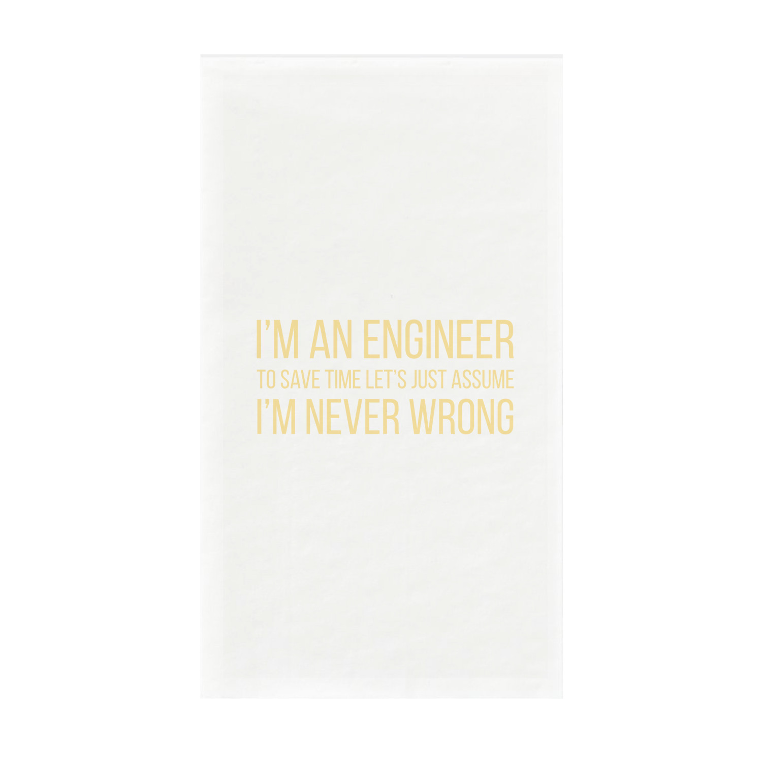 The main focus of this design is a funny quote that says "I'm an engineer, to save time let's just assume I'm never wrong." This will be sure to get anyone to crack a smile. The background is a blueprint pattern with gears and other shapes. The main colors are blue and light yellow. Your personalization goes directly under the quote.