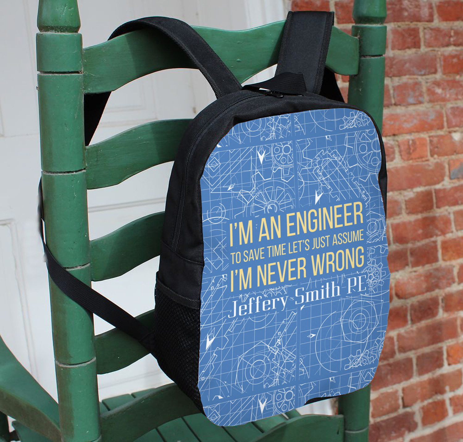 The main focus of this design is a funny quote that says "I'm an engineer, to save time let's just assume I'm never wrong." This will be sure to get anyone to crack a smile. The background is a blueprint pattern with gears and other shapes. The main colors are blue and light yellow. Your personalization goes directly under the quote.