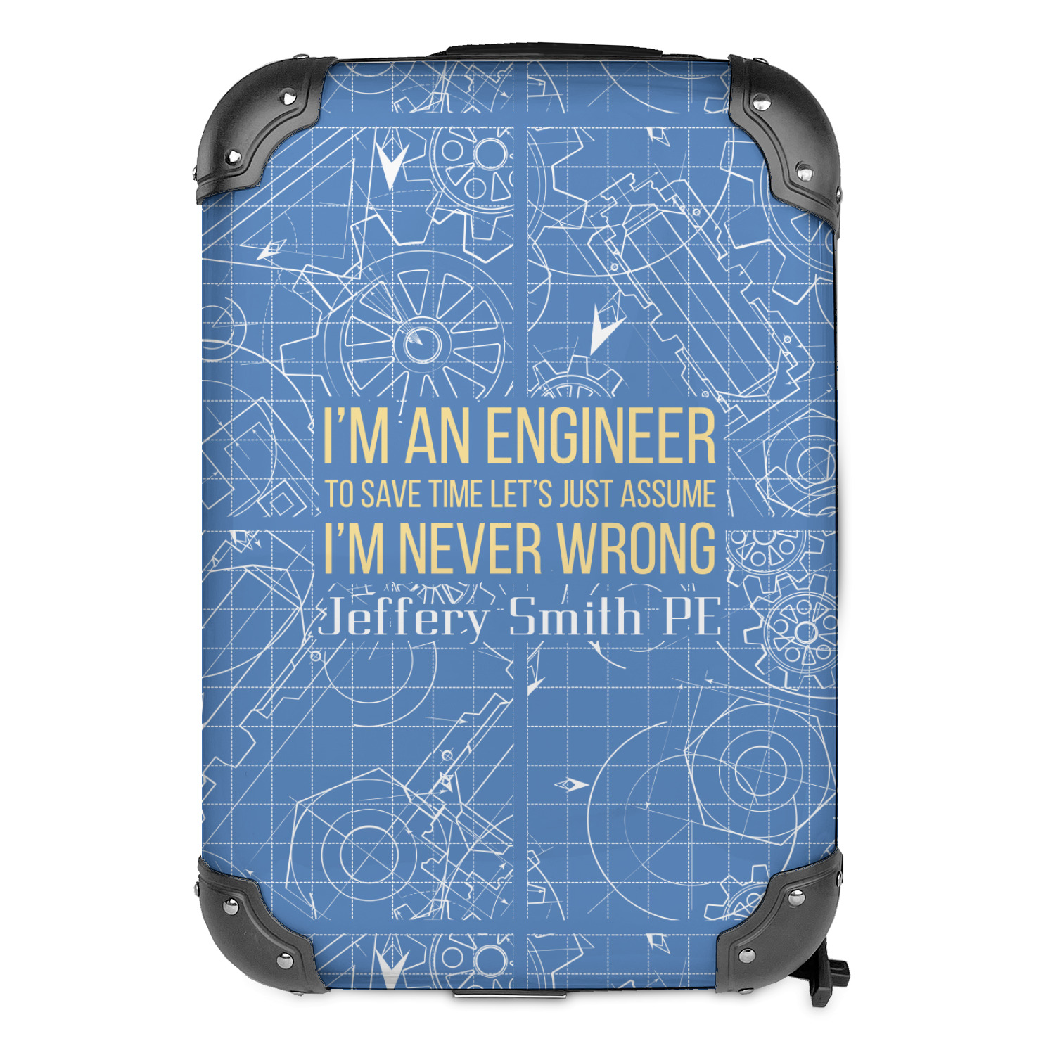 The main focus of this design is a funny quote that says "I'm an engineer, to save time let's just assume I'm never wrong." This will be sure to get anyone to crack a smile. The background is a blueprint pattern with gears and other shapes. The main colors are blue and light yellow. Your personalization goes directly under the quote.