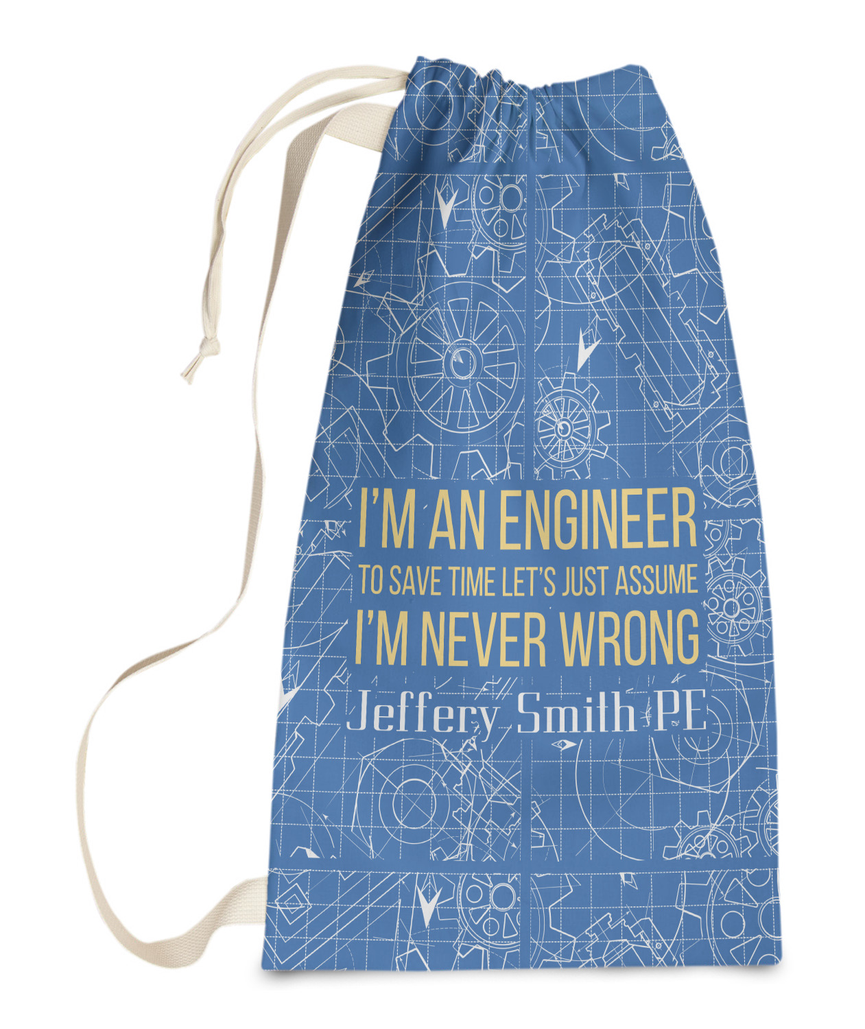 The main focus of this design is a funny quote that says "I'm an engineer, to save time let's just assume I'm never wrong." This will be sure to get anyone to crack a smile. The background is a blueprint pattern with gears and other shapes. The main colors are blue and light yellow. Your personalization goes directly under the quote.