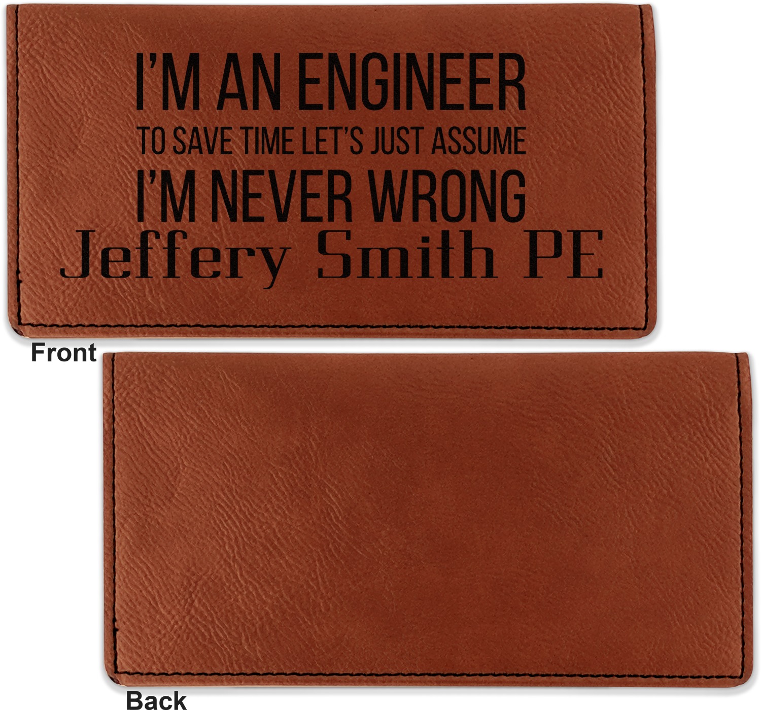 Go into our design center to start personalizing. Your checkbook cover will be laser engraved, making the graphic or text a black color. Choose a fun saying, monogram, or font to go on your checkbook cover. You have the opportunity to do it double or single sided.