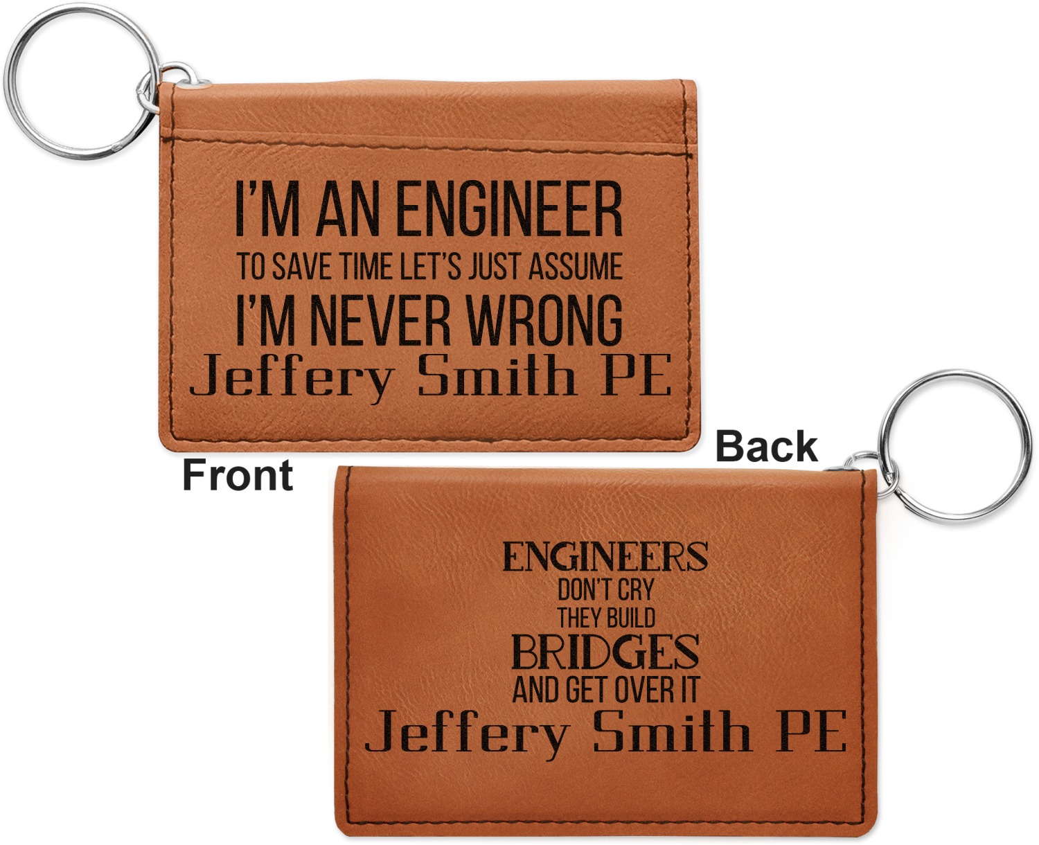 These ID wallet keychains features three pockets on the inside to accommodate your ID and your most frequently used cards. Another pocket occupies the front of the wallet's exterior, and can hold some cash or another card. The wallet is accompanied by a thick metal ring for easy attachment to a belt clip or purse. Each card holder keychain measures at 4.25 by 3 inches and is a beautiful, cognac, medium-brown shade. The personalized monogram, font, or graphic of your choosing is laser engraved into the surface of the wallet, creating a black imprint. We sell these ID wallets in two models: single sided and double sided engraving.