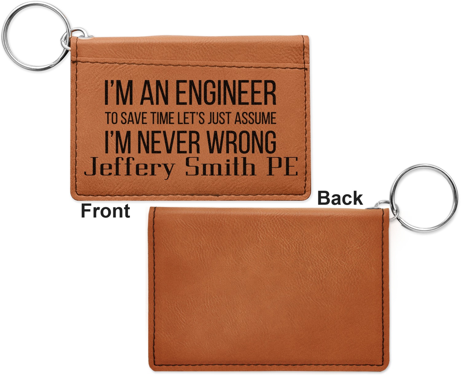These ID wallet keychains features three pockets on the inside to accommodate your ID and your most frequently used cards. Another pocket occupies the front of the wallet's exterior, and can hold some cash or another card. The wallet is accompanied by a thick metal ring for easy attachment to a belt clip or purse. Each card holder keychain measures at 4.25 by 3 inches and is a beautiful, cognac, medium-brown shade. The personalized monogram, font, or graphic of your choosing is laser engraved into the surface of the wallet, creating a black imprint. We sell these ID wallets in two models: single sided and double sided engraving.