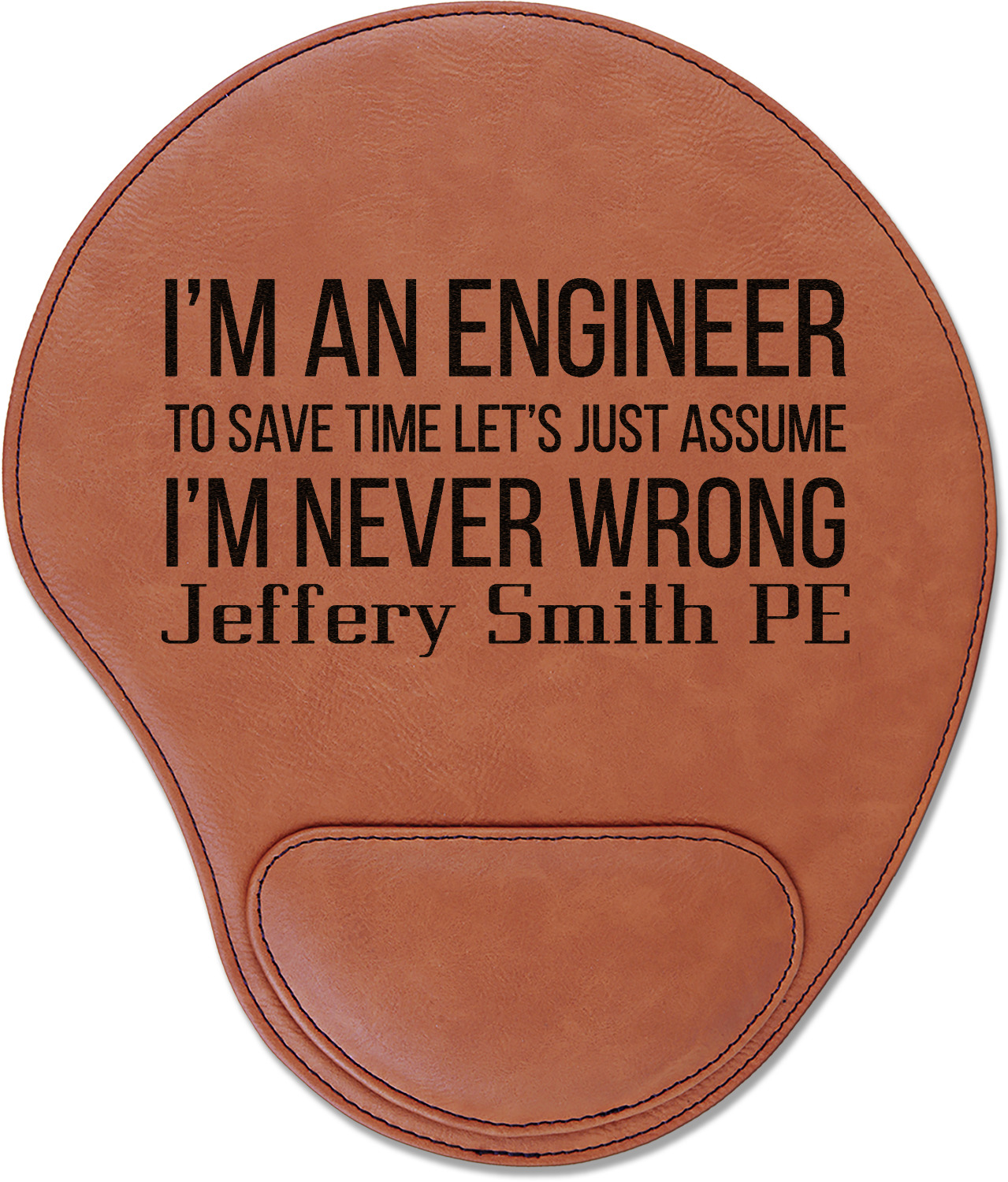 In a rounded shape, this mouse pad is made of a luxurious, cognac-colored leatherette. The nature of this material allows your mouse to glide smoothly across its surface. Strong stitching lines the edges to guarantee stability and strength. As added support for tired wrists, your personalized mouse pad features a supportive wrist rest at its bottom. This model measures at 10.25" x 9", while its wrist pad is approximately 5" x 2.75", with a thickness of 0.75". Your personalized design is laser engraved into the front face of this mouse pad.