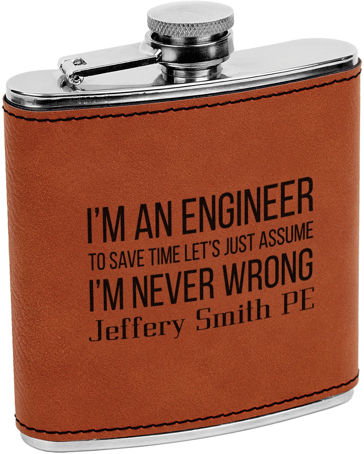 Sip your beverage in a classy fashion with one of our stainless steel flasks! These flasks are sold with an engraved, leatherette wrap that you customize! The refined look of these hip flasks make them the perfect gift for a loved one!