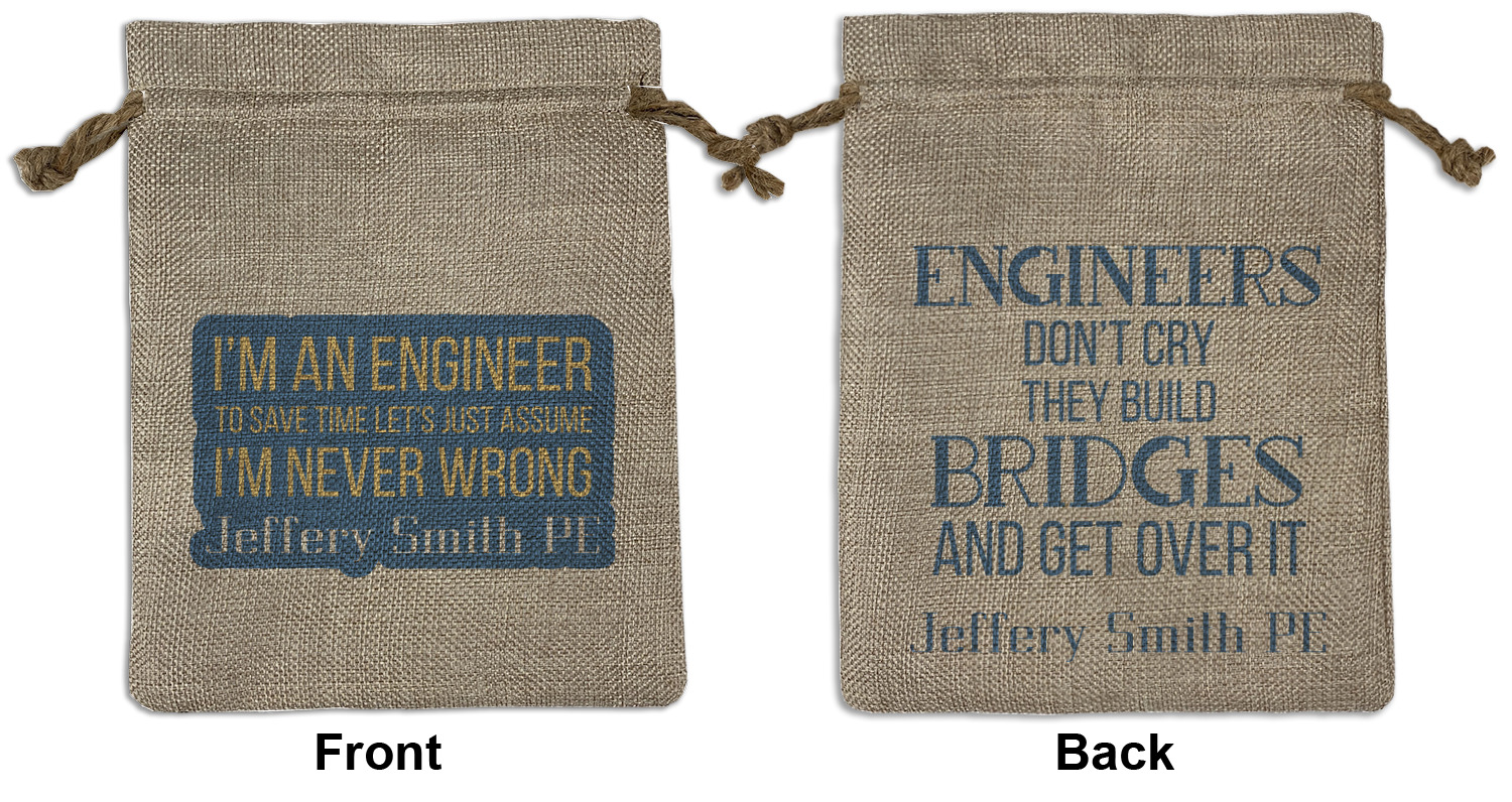 We sell our Burlap Gift Bags in 3 variant sized bags. Made with burlap polyester, each personalized bag can be secured with a twine drawstring pull. Your custom design is available to print on one side or both sides - completely up to you! The sizes of the bags measure approximately 4.5" x 6.5" for the smallest size, 6.5" x 8.0" for the medium size, and 6.5" x 13.5" for the large-sized bag.