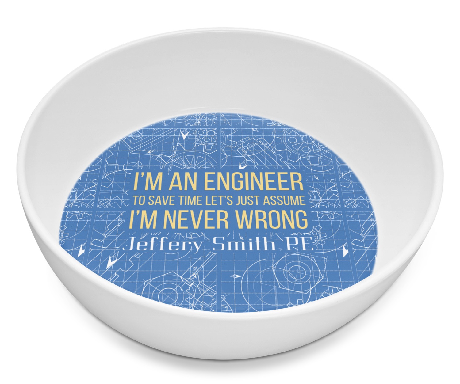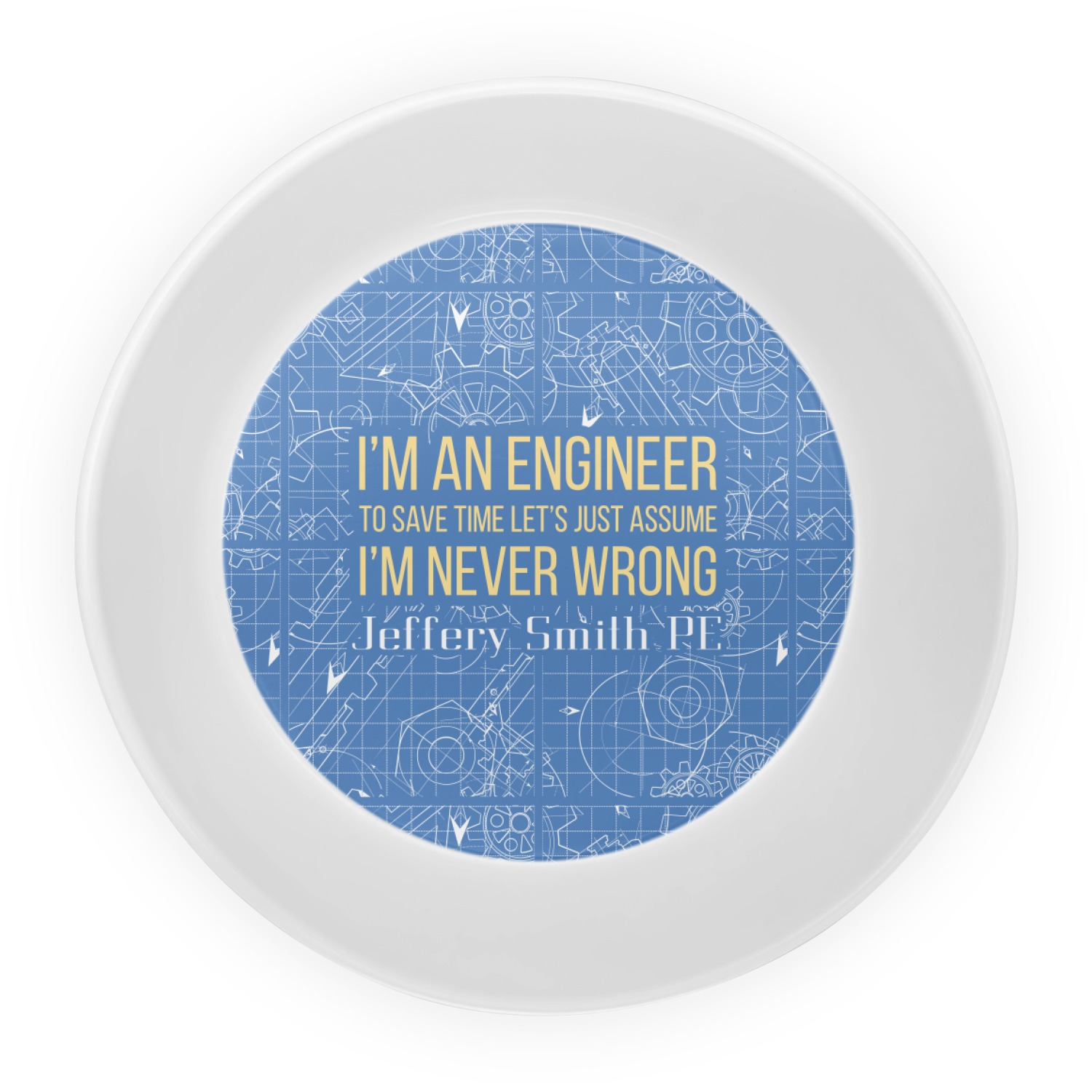 The main focus of this design is a funny quote that says "I'm an engineer, to save time let's just assume I'm never wrong." This will be sure to get anyone to crack a smile. The background is a blueprint pattern with gears and other shapes. The main colors are blue and light yellow. Your personalization goes directly under the quote.
