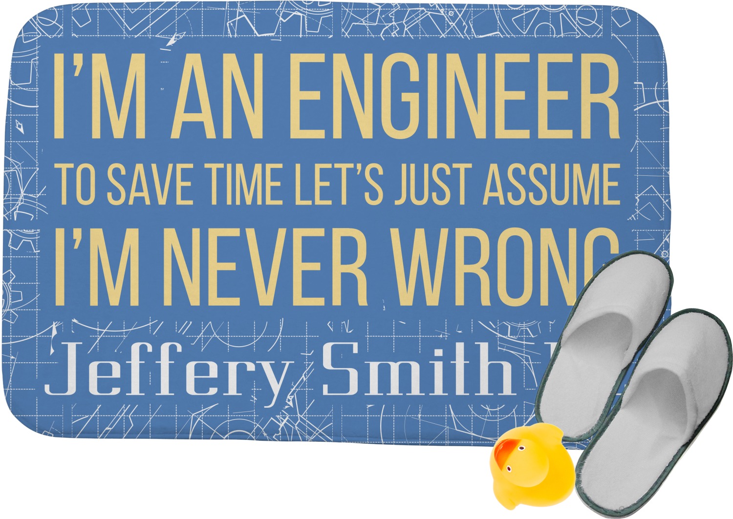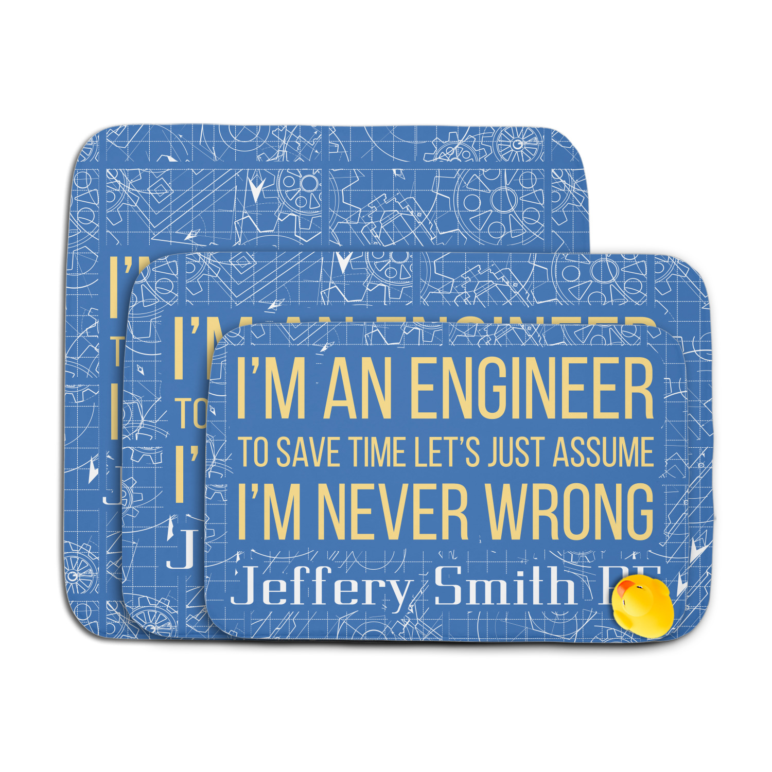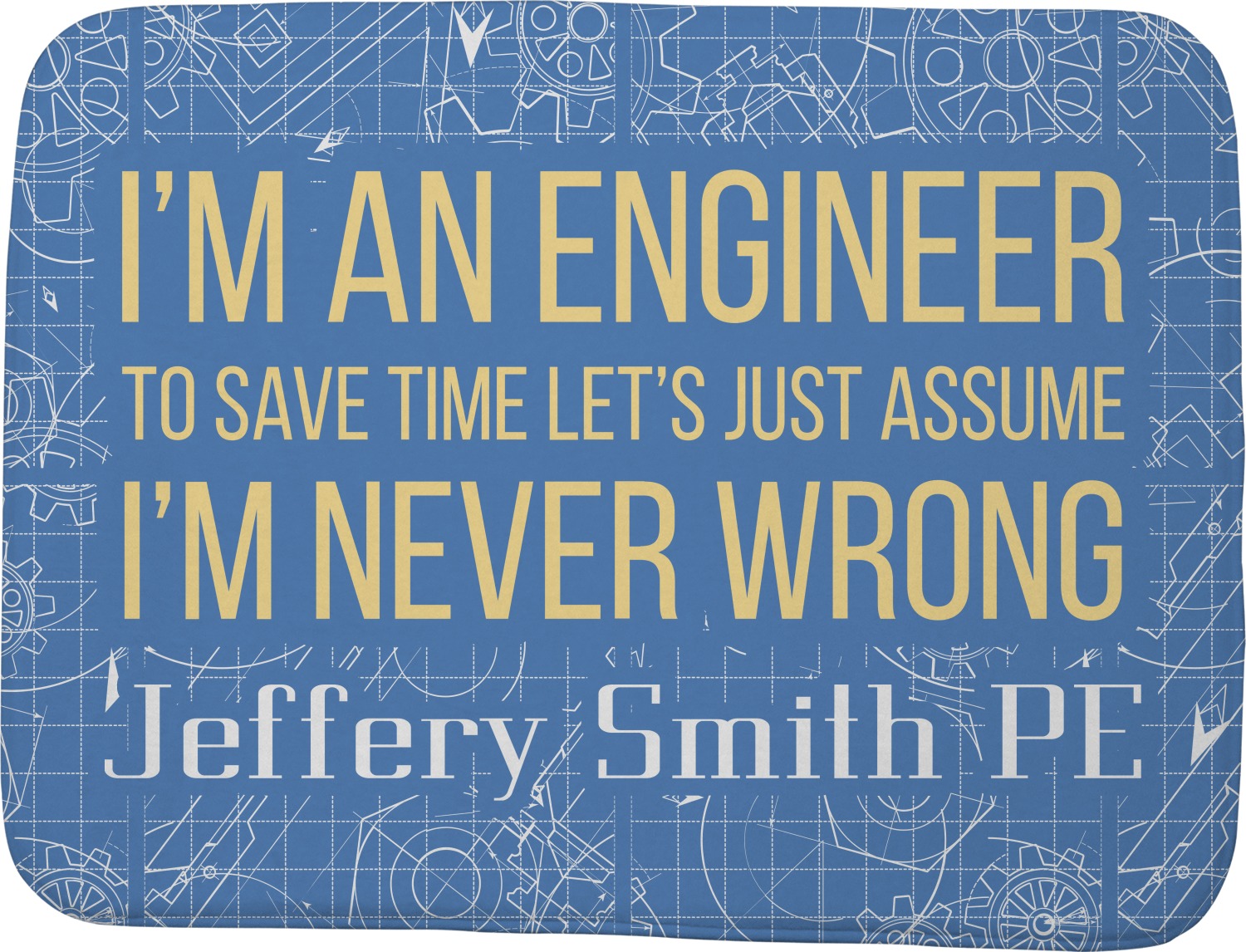 The main focus of this design is a funny quote that says "I'm an engineer, to save time let's just assume I'm never wrong." This will be sure to get anyone to crack a smile. The background is a blueprint pattern with gears and other shapes. The main colors are blue and light yellow. Your personalization goes directly under the quote.