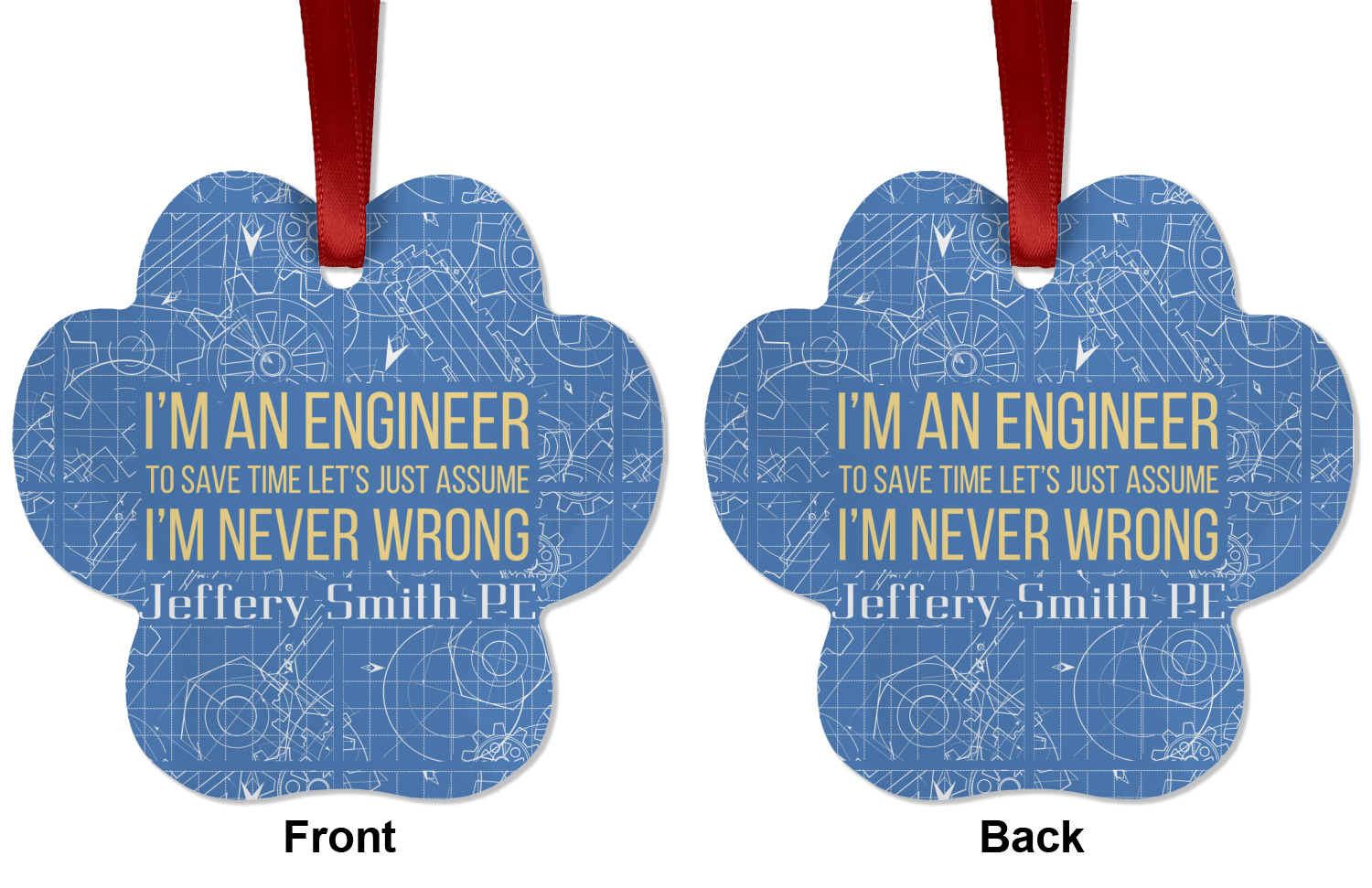 The main focus of this design is a funny quote that says "I'm an engineer, to save time let's just assume I'm never wrong." This will be sure to get anyone to crack a smile. The background is a blueprint pattern with gears and other shapes. The main colors are blue and light yellow. Your personalization goes directly under the quote.