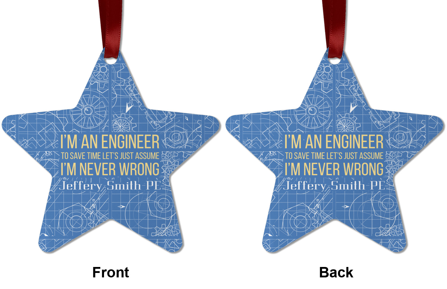The main focus of this design is a funny quote that says "I'm an engineer, to save time let's just assume I'm never wrong." This will be sure to get anyone to crack a smile. The background is a blueprint pattern with gears and other shapes. The main colors are blue and light yellow. Your personalization goes directly under the quote.