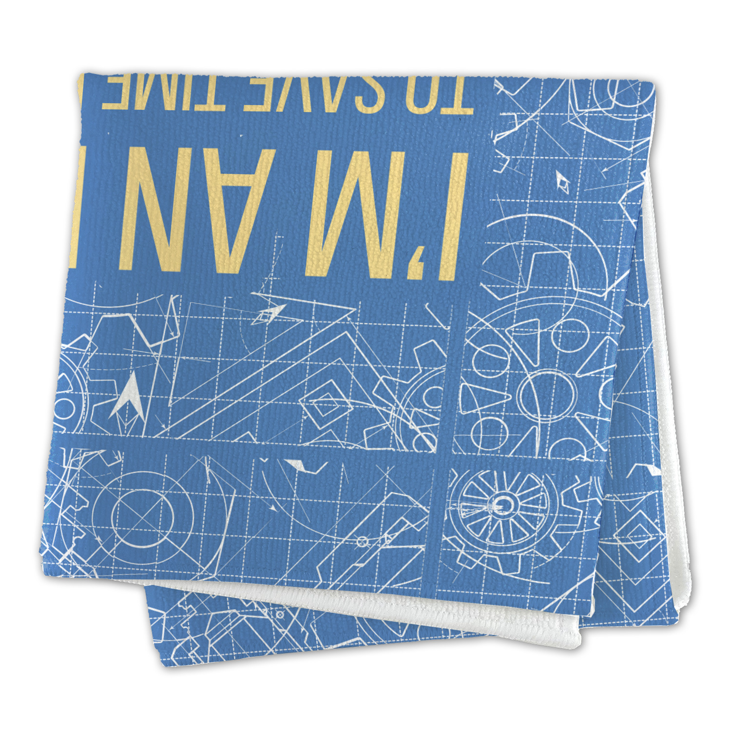 The main focus of this design is a funny quote that says "I'm an engineer, to save time let's just assume I'm never wrong." This will be sure to get anyone to crack a smile. The background is a blueprint pattern with gears and other shapes. The main colors are blue and light yellow. Your personalization goes directly under the quote.
