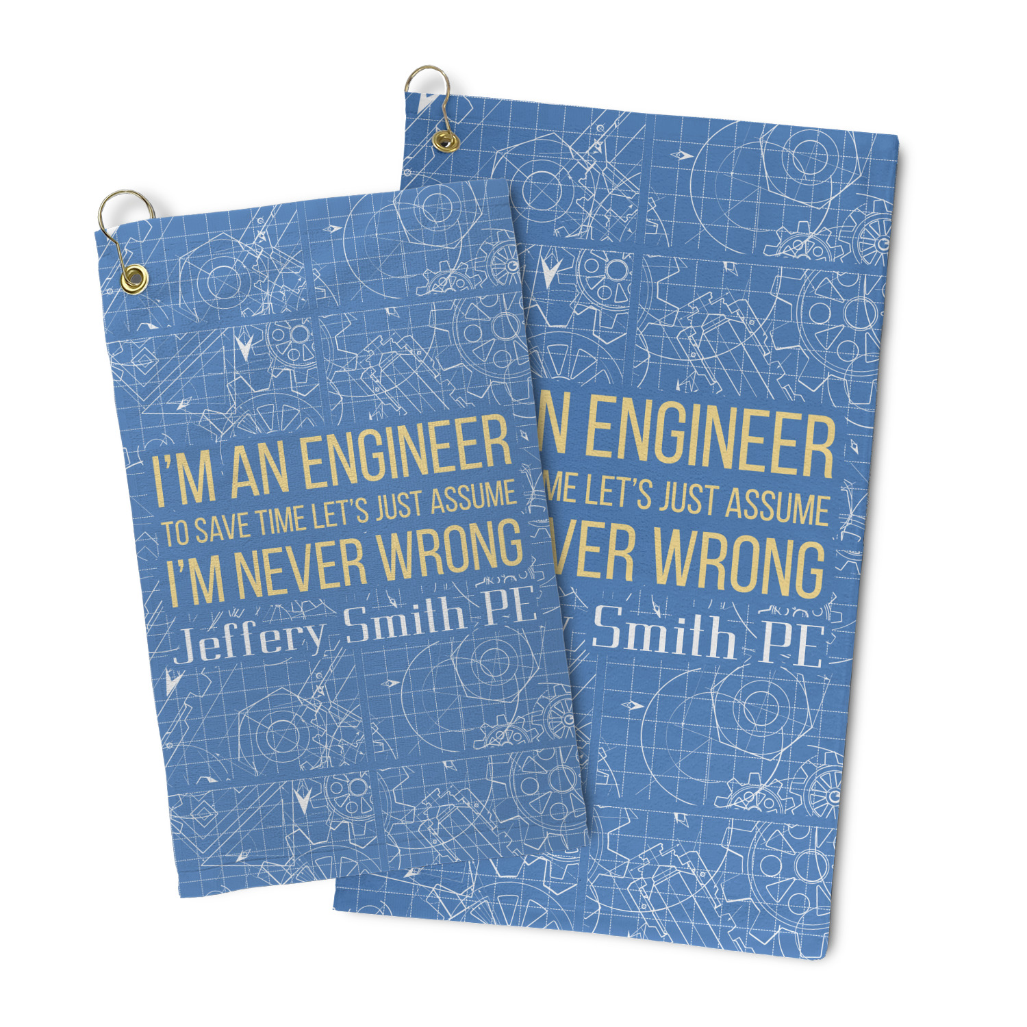 The main focus of this design is a funny quote that says "I'm an engineer, to save time let's just assume I'm never wrong." This will be sure to get anyone to crack a smile. The background is a blueprint pattern with gears and other shapes. The main colors are blue and light yellow. Your personalization goes directly under the quote.
