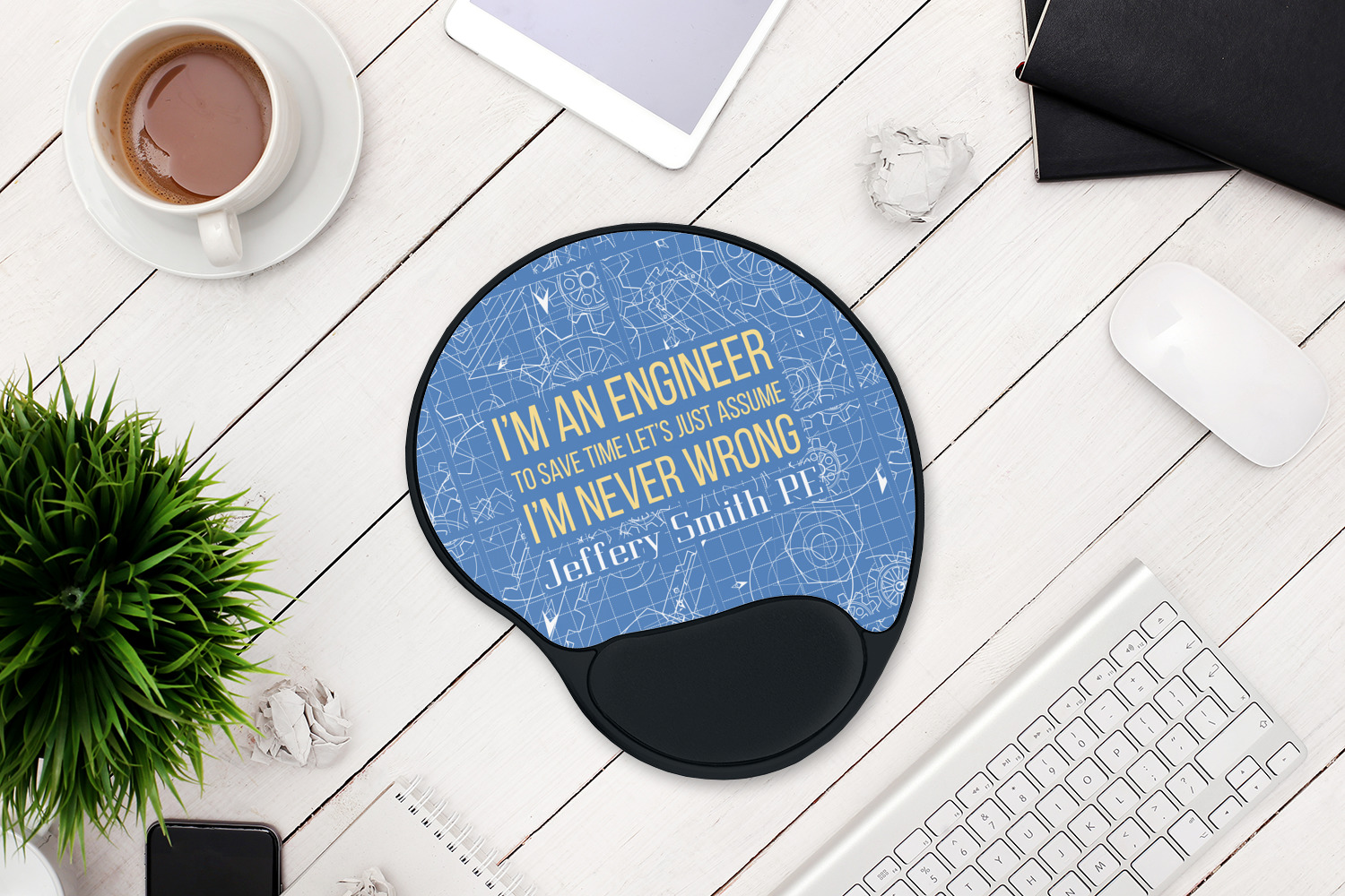 The main focus of this design is a funny quote that says "I'm an engineer, to save time let's just assume I'm never wrong." This will be sure to get anyone to crack a smile. The background is a blueprint pattern with gears and other shapes. The main colors are blue and light yellow. Your personalization goes directly under the quote.