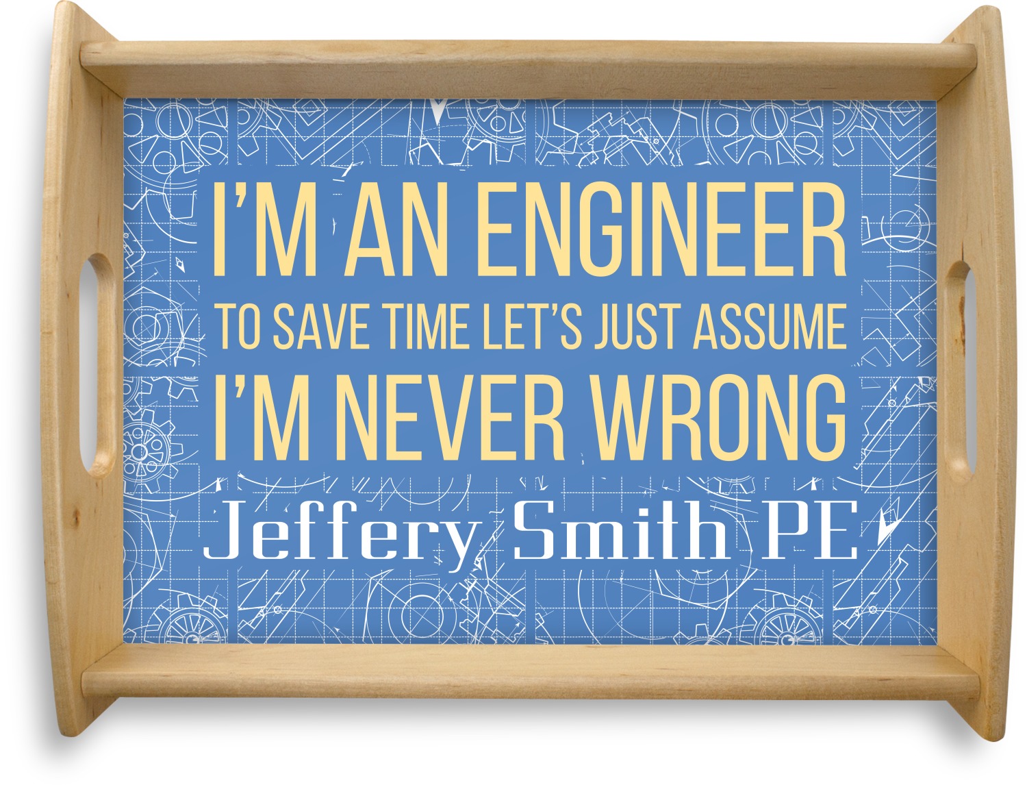 The main focus of this design is a funny quote that says "I'm an engineer, to save time let's just assume I'm never wrong." This will be sure to get anyone to crack a smile. The background is a blueprint pattern with gears and other shapes. The main colors are blue and light yellow. Your personalization goes directly under the quote.