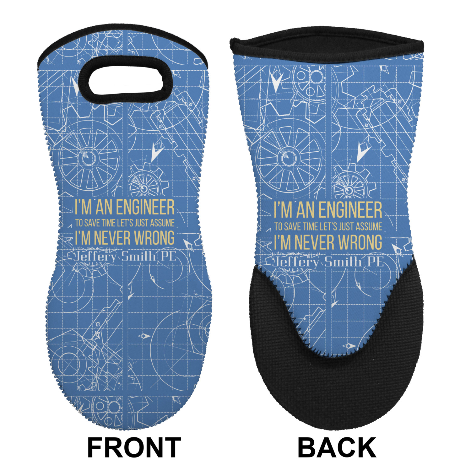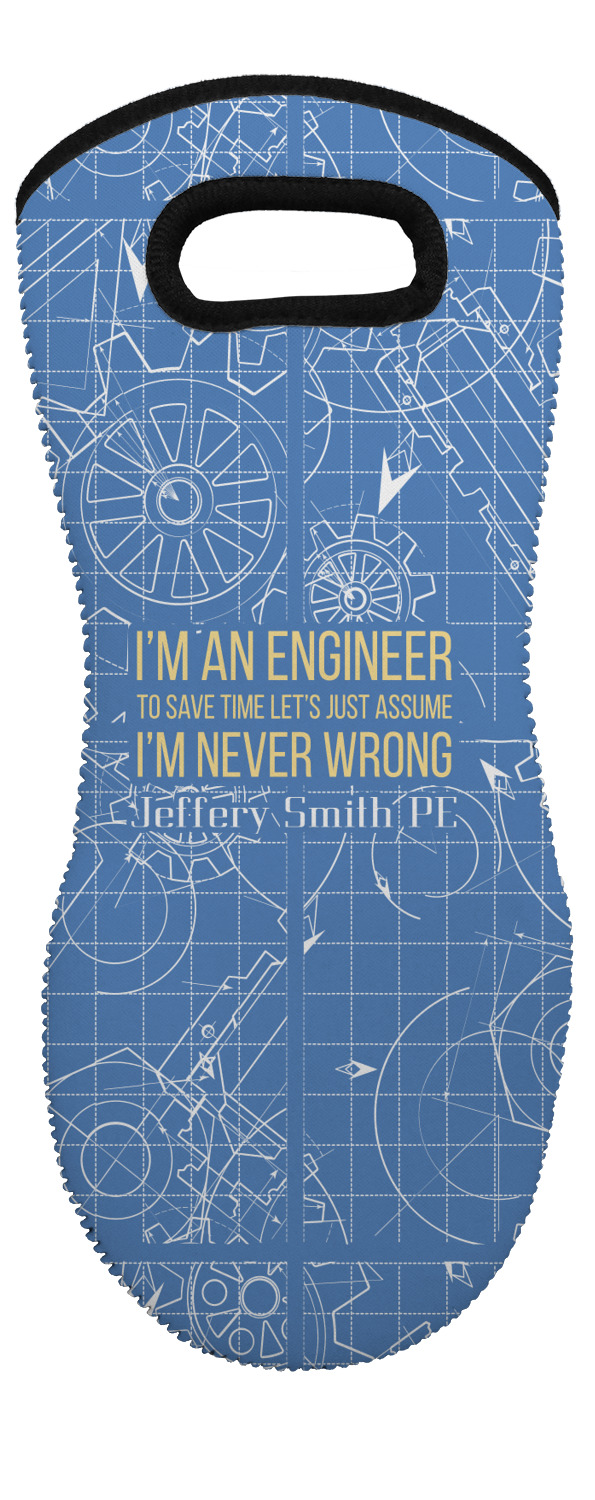 The main focus of this design is a funny quote that says "I'm an engineer, to save time let's just assume I'm never wrong." This will be sure to get anyone to crack a smile. The background is a blueprint pattern with gears and other shapes. The main colors are blue and light yellow. Your personalization goes directly under the quote.
