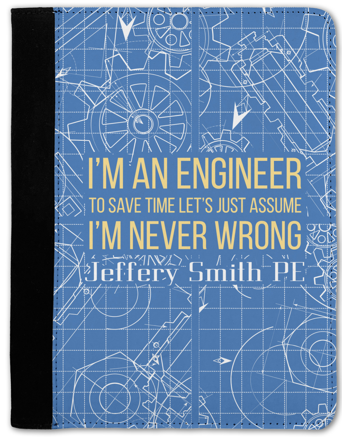 The main focus of this design is a funny quote that says "I'm an engineer, to save time let's just assume I'm never wrong." This will be sure to get anyone to crack a smile. The background is a blueprint pattern with gears and other shapes. The main colors are blue and light yellow. Your personalization goes directly under the quote.