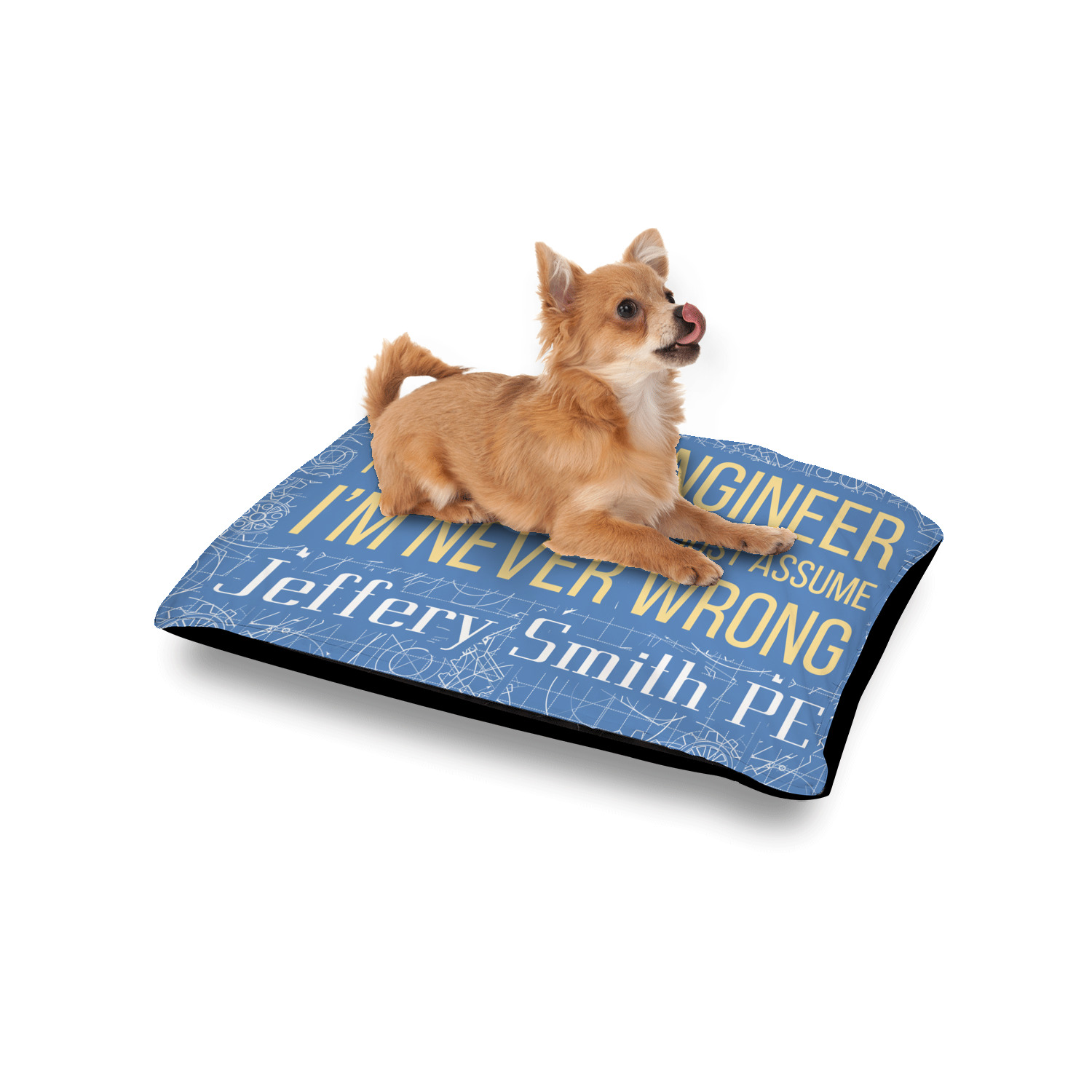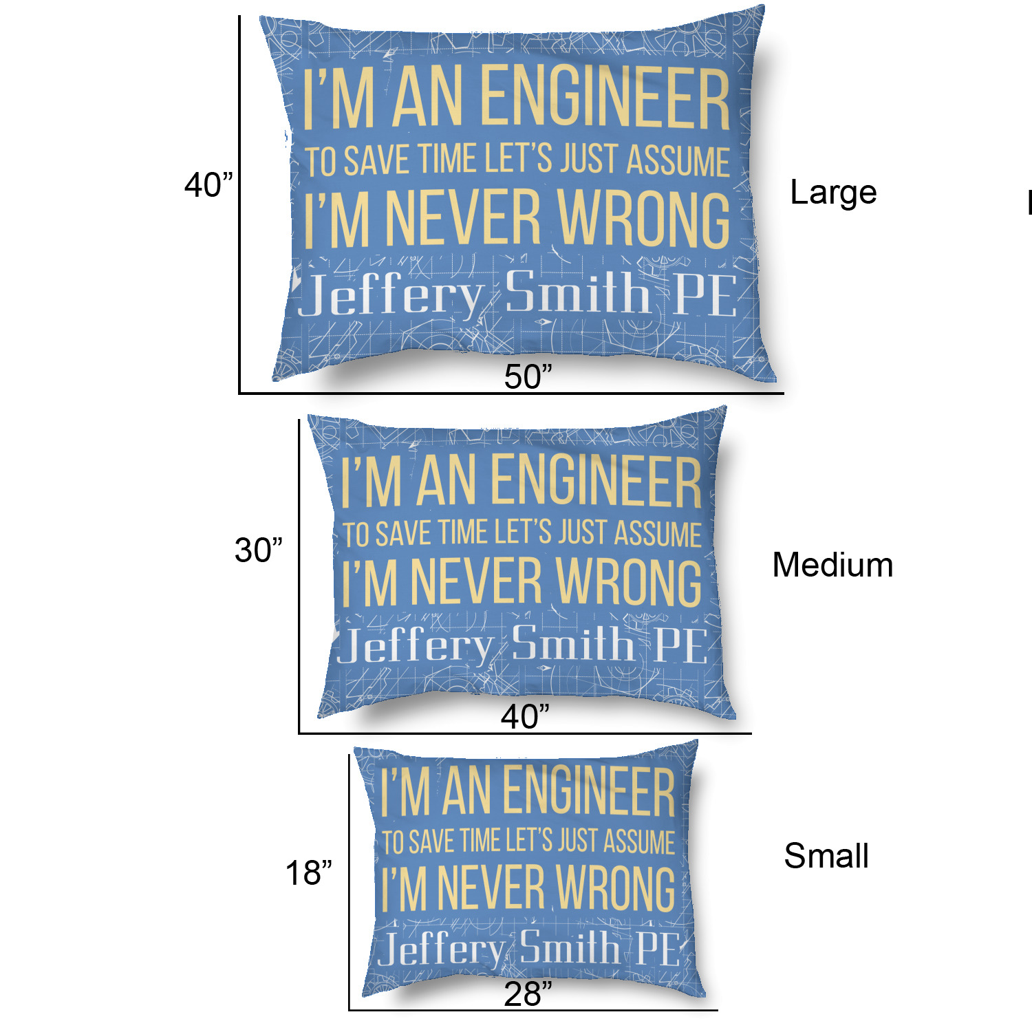 The main focus of this design is a funny quote that says "I'm an engineer, to save time let's just assume I'm never wrong." This will be sure to get anyone to crack a smile. The background is a blueprint pattern with gears and other shapes. The main colors are blue and light yellow. Your personalization goes directly under the quote.