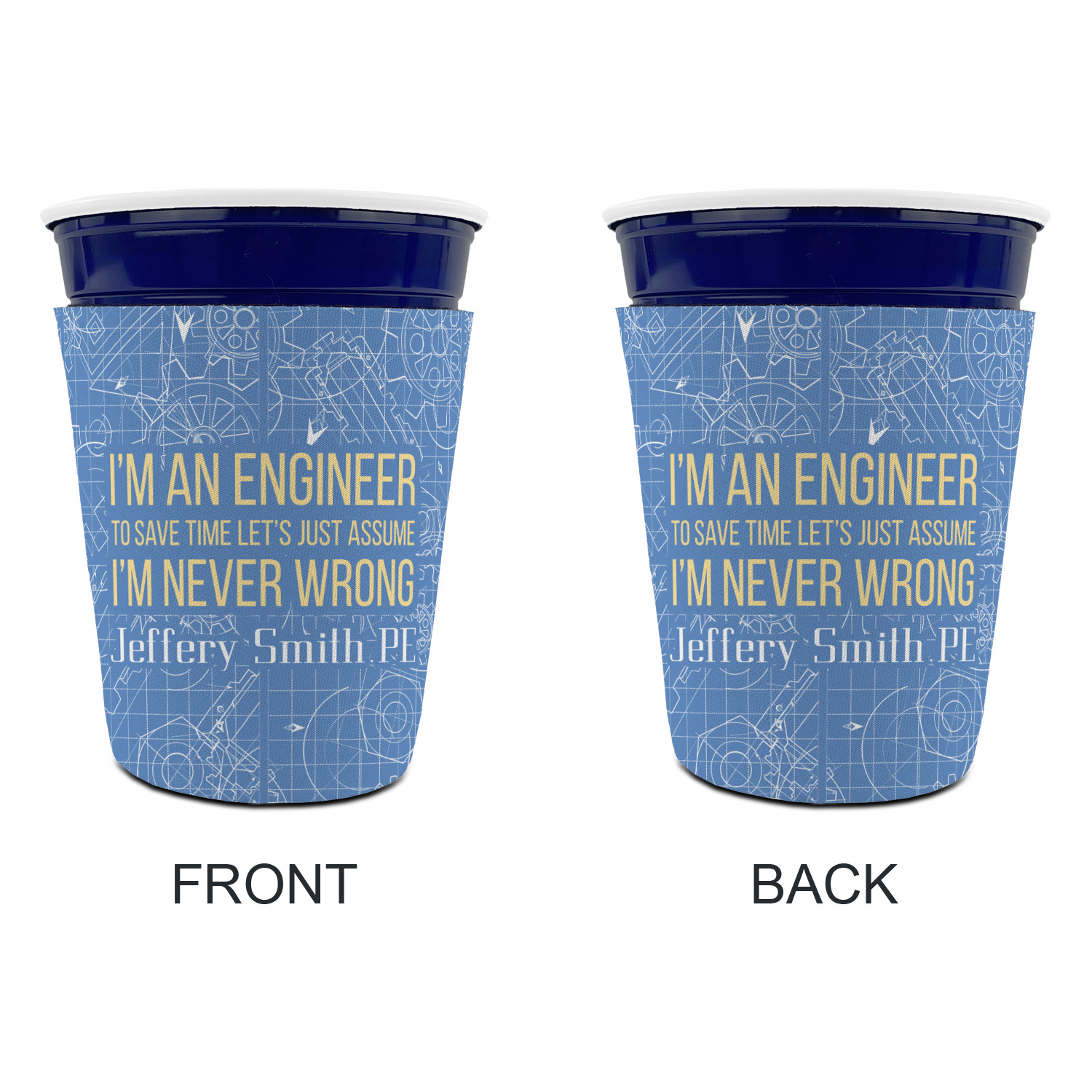 The main focus of this design is a funny quote that says "I'm an engineer, to save time let's just assume I'm never wrong." This will be sure to get anyone to crack a smile. The background is a blueprint pattern with gears and other shapes. The main colors are blue and light yellow. Your personalization goes directly under the quote.