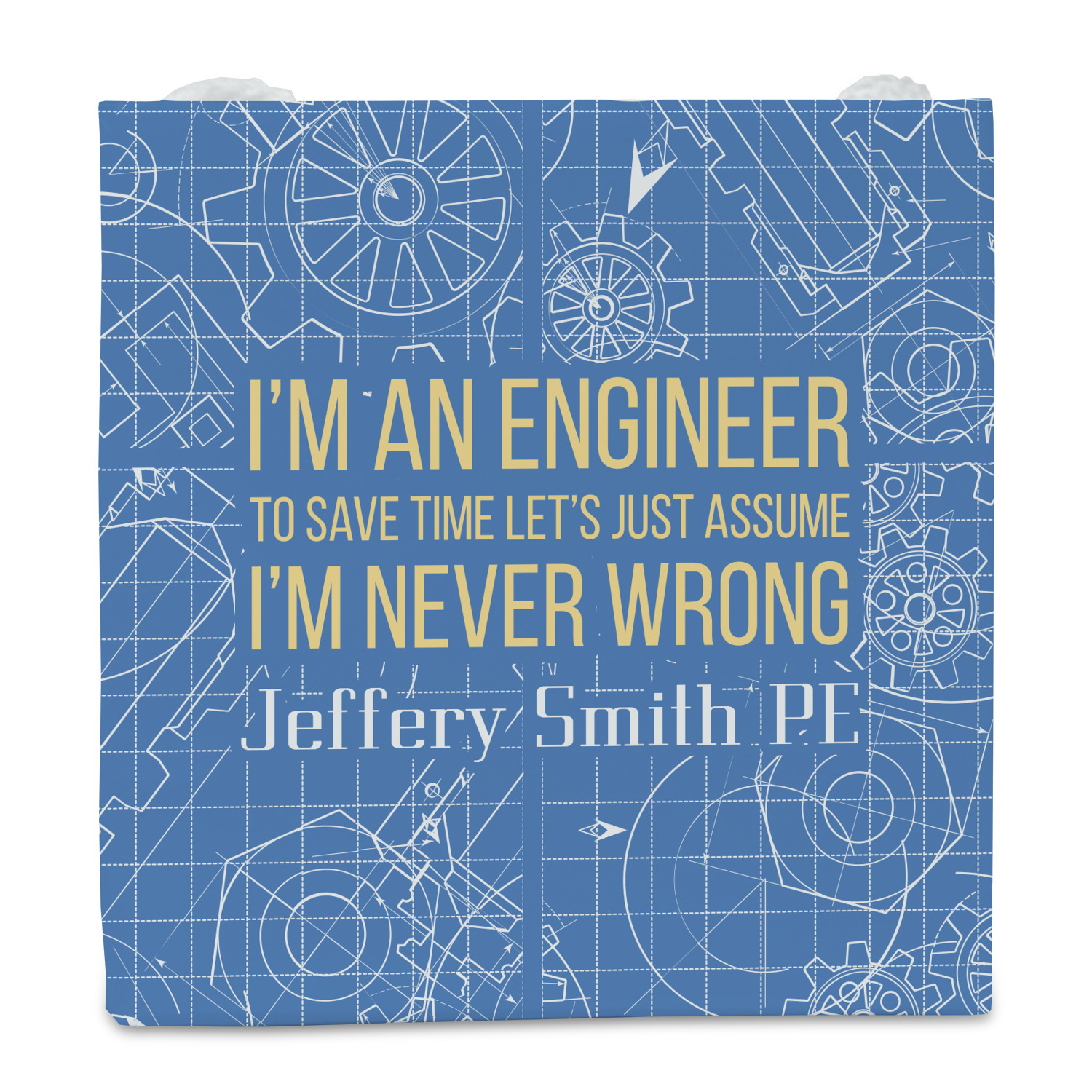 The main focus of this design is a funny quote that says "I'm an engineer, to save time let's just assume I'm never wrong." This will be sure to get anyone to crack a smile. The background is a blueprint pattern with gears and other shapes. The main colors are blue and light yellow. Your personalization goes directly under the quote.
