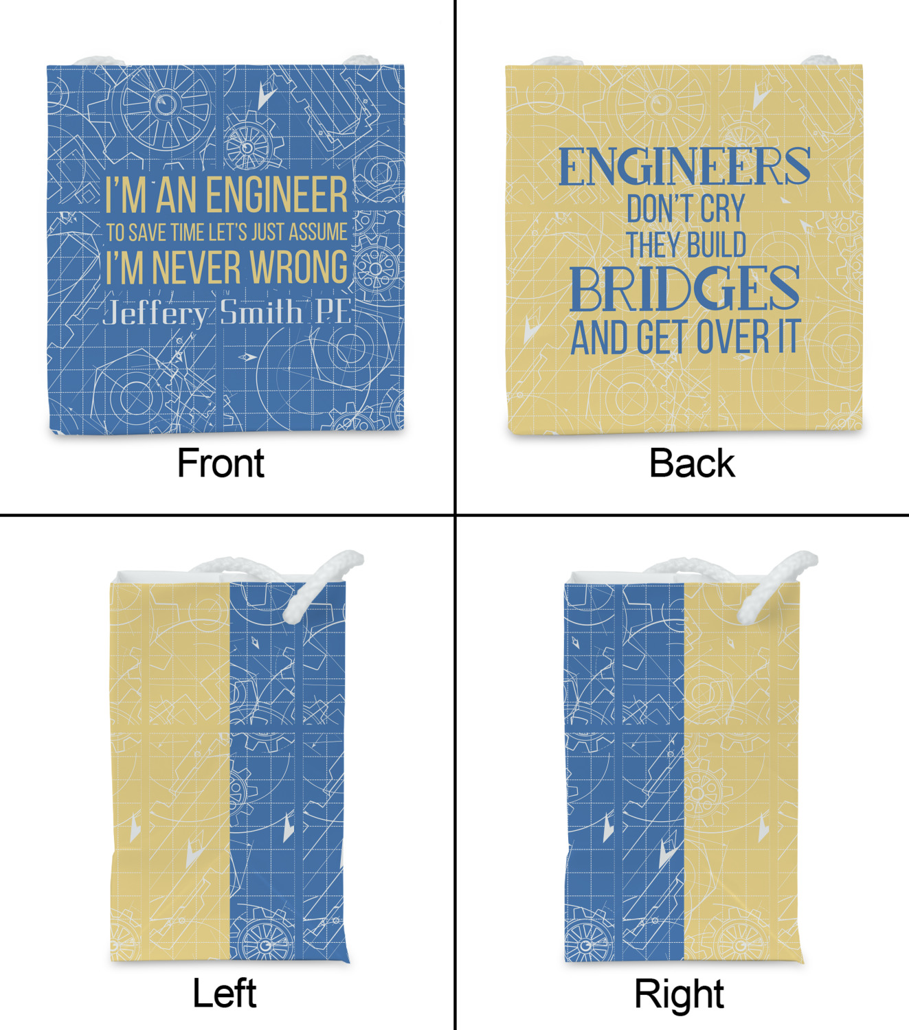 The main focus of this design is a funny quote that says "I'm an engineer, to save time let's just assume I'm never wrong." This will be sure to get anyone to crack a smile. The background is a blueprint pattern with gears and other shapes. The main colors are blue and light yellow. Your personalization goes directly under the quote.