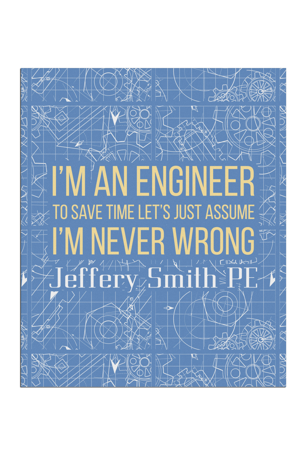The main focus of this design is a funny quote that says "I'm an engineer, to save time let's just assume I'm never wrong." This will be sure to get anyone to crack a smile. The background is a blueprint pattern with gears and other shapes. The main colors are blue and light yellow. Your personalization goes directly under the quote.