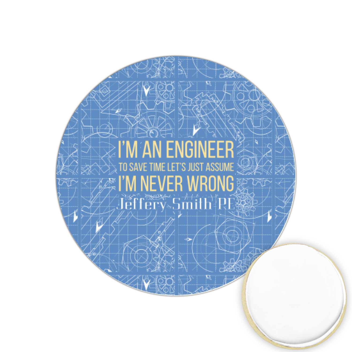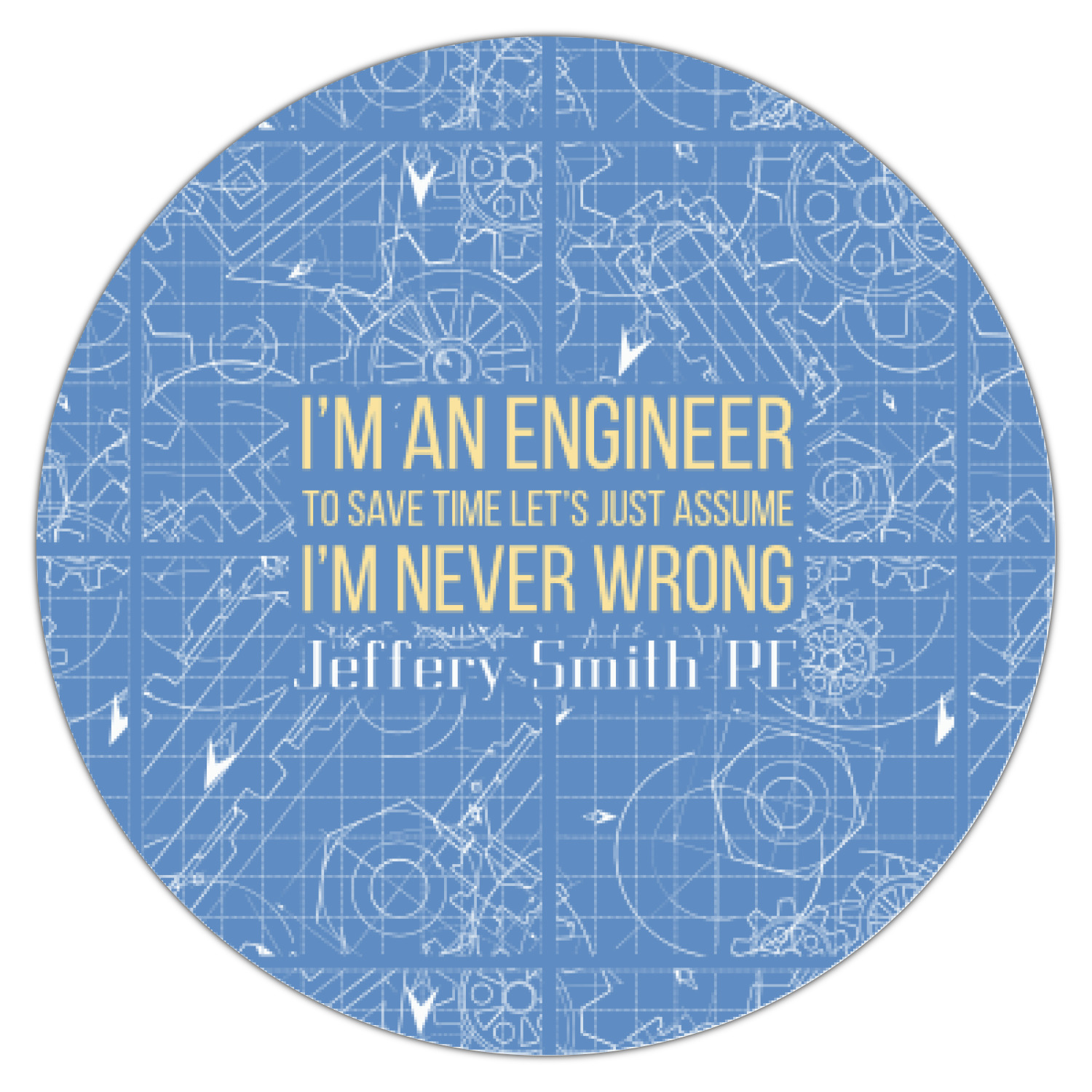 The main focus of this design is a funny quote that says "I'm an engineer, to save time let's just assume I'm never wrong." This will be sure to get anyone to crack a smile. The background is a blueprint pattern with gears and other shapes. The main colors are blue and light yellow. Your personalization goes directly under the quote.