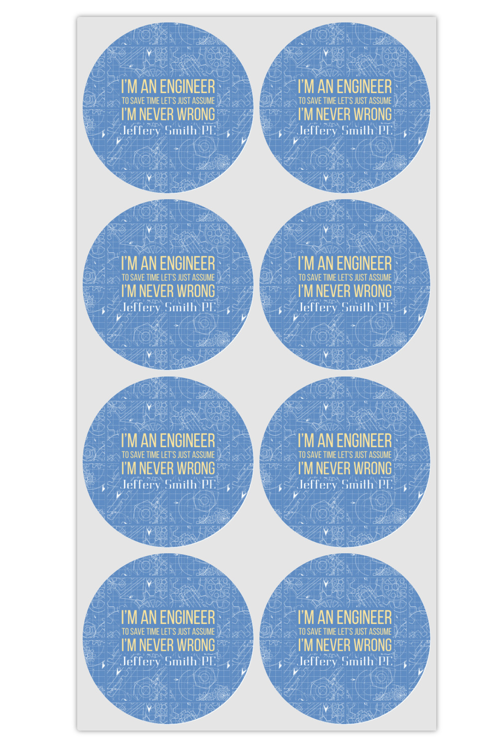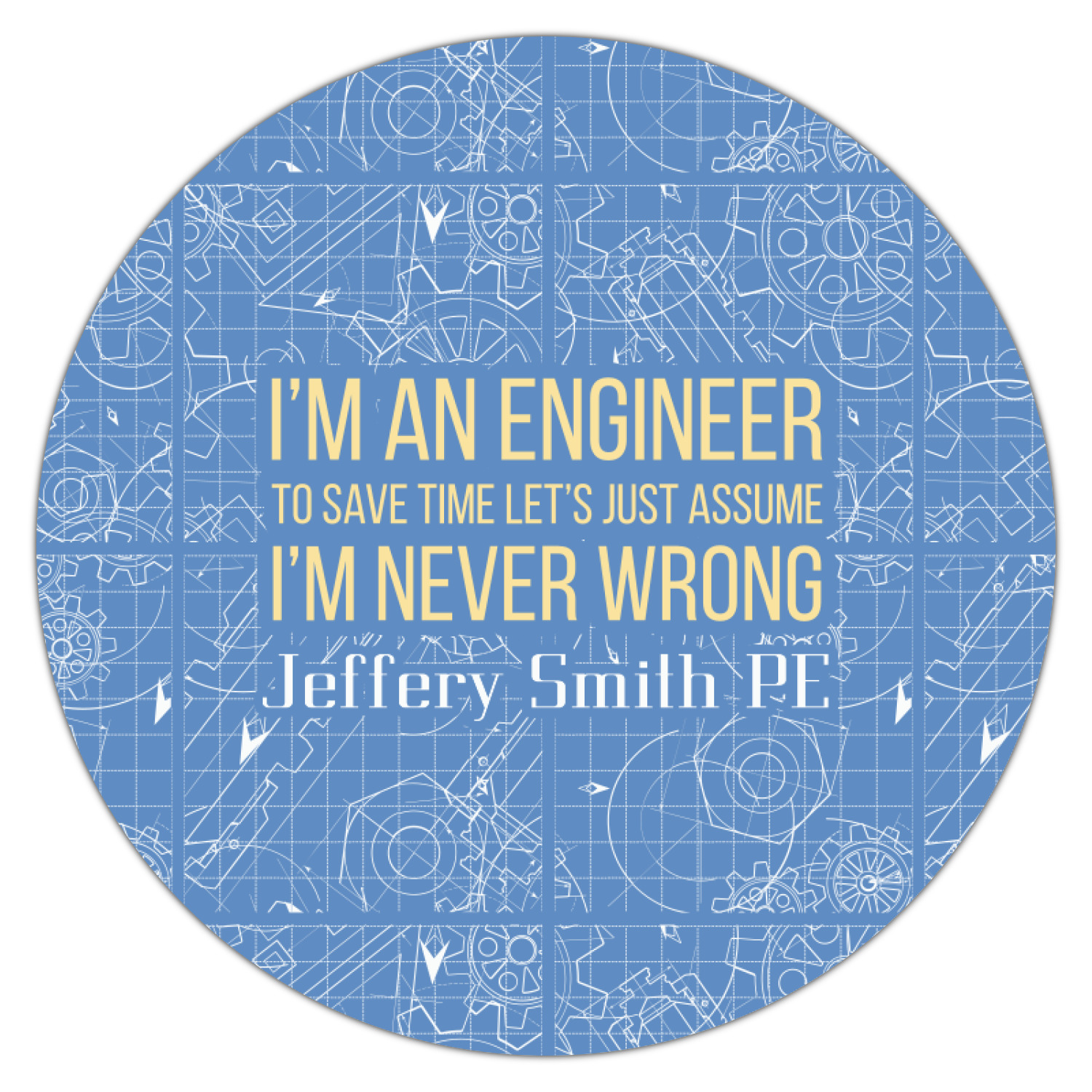 The main focus of this design is a funny quote that says "I'm an engineer, to save time let's just assume I'm never wrong." This will be sure to get anyone to crack a smile. The background is a blueprint pattern with gears and other shapes. The main colors are blue and light yellow. Your personalization goes directly under the quote.