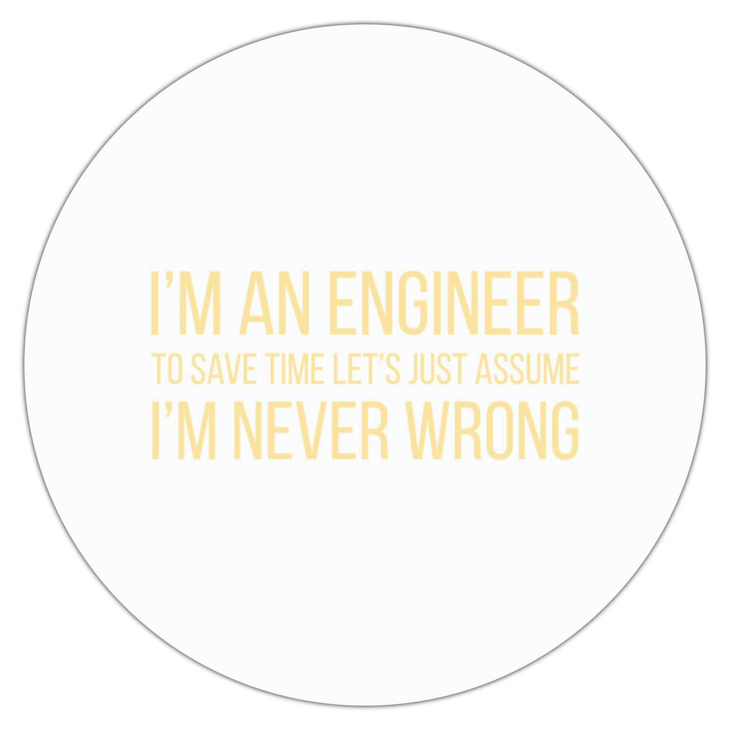 The main focus of this design is a funny quote that says "I'm an engineer, to save time let's just assume I'm never wrong." This will be sure to get anyone to crack a smile. The background is a blueprint pattern with gears and other shapes. The main colors are blue and light yellow. Your personalization goes directly under the quote.