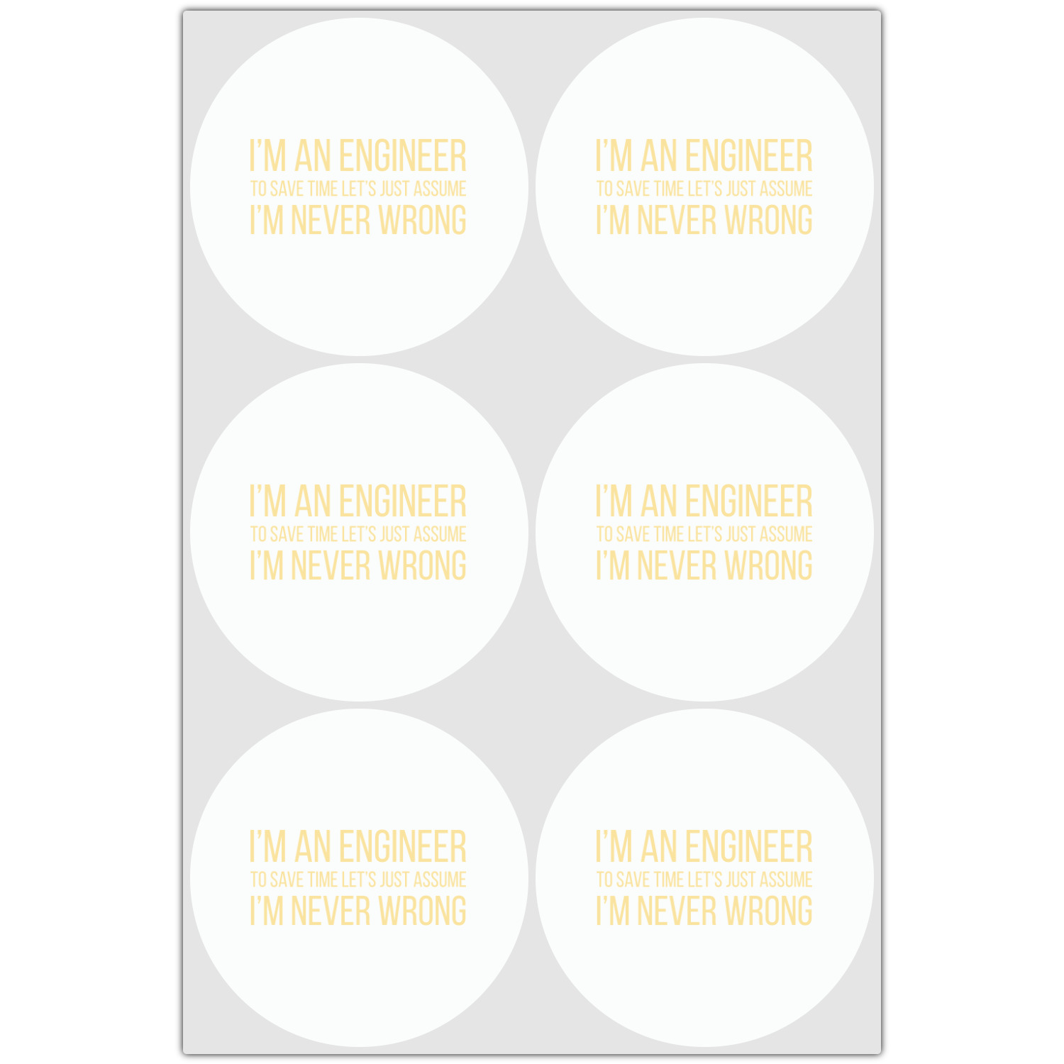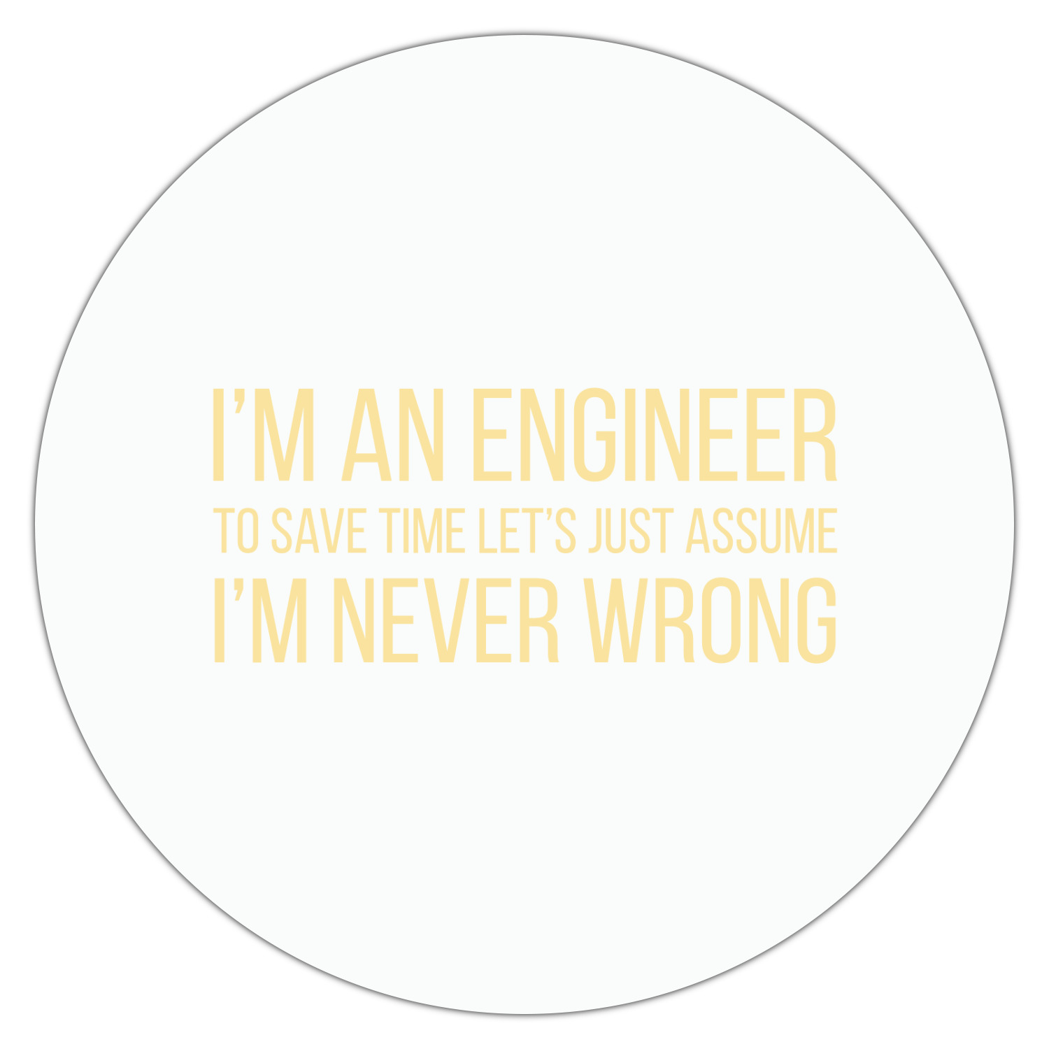 The main focus of this design is a funny quote that says "I'm an engineer, to save time let's just assume I'm never wrong." This will be sure to get anyone to crack a smile. The background is a blueprint pattern with gears and other shapes. The main colors are blue and light yellow. Your personalization goes directly under the quote.