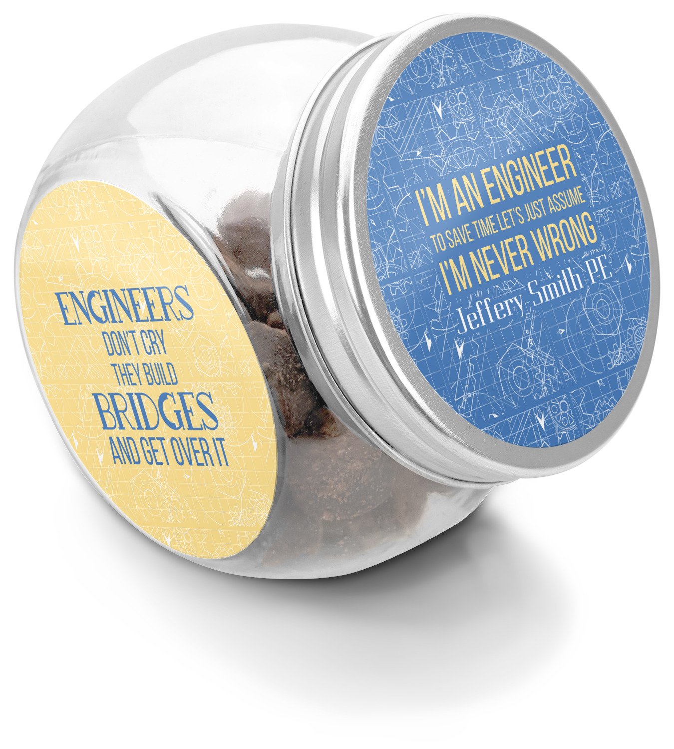 The main focus of this design is a funny quote that says "I'm an engineer, to save time let's just assume I'm never wrong." This will be sure to get anyone to crack a smile. The background is a blueprint pattern with gears and other shapes. The main colors are blue and light yellow. Your personalization goes directly under the quote.