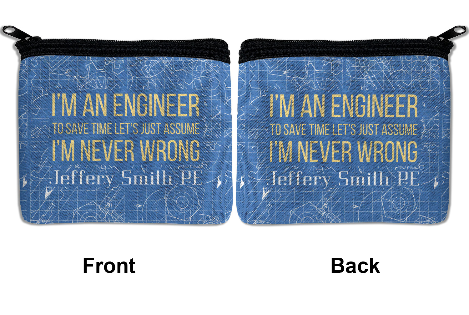 The main focus of this design is a funny quote that says "I'm an engineer, to save time let's just assume I'm never wrong." This will be sure to get anyone to crack a smile. The background is a blueprint pattern with gears and other shapes. The main colors are blue and light yellow. Your personalization goes directly under the quote.