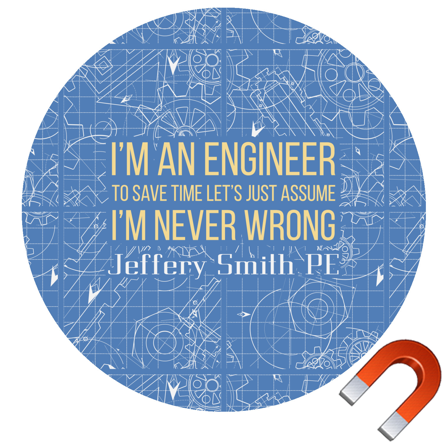 The main focus of this design is a funny quote that says "I'm an engineer, to save time let's just assume I'm never wrong." This will be sure to get anyone to crack a smile. The background is a blueprint pattern with gears and other shapes. The main colors are blue and light yellow. Your personalization goes directly under the quote.