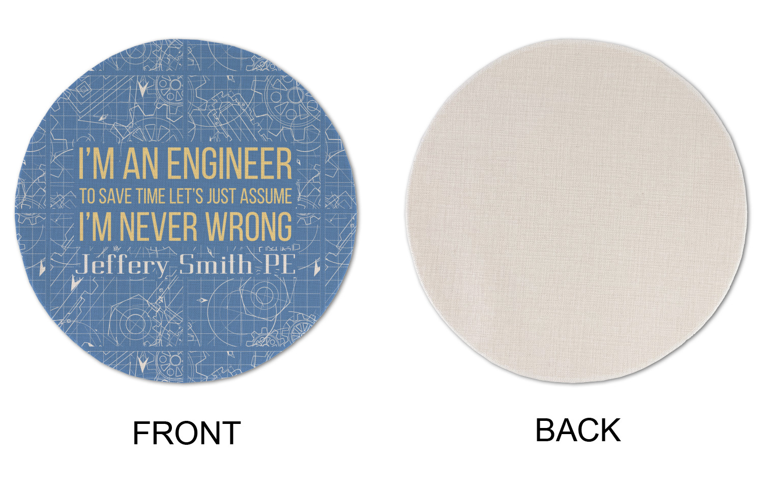 The main focus of this design is a funny quote that says "I'm an engineer, to save time let's just assume I'm never wrong." This will be sure to get anyone to crack a smile. The background is a blueprint pattern with gears and other shapes. The main colors are blue and light yellow. Your personalization goes directly under the quote.