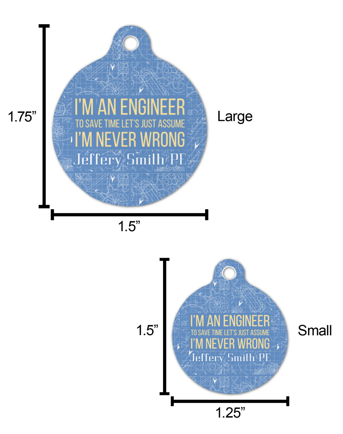 The main focus of this design is a funny quote that says "I'm an engineer, to save time let's just assume I'm never wrong." This will be sure to get anyone to crack a smile. The background is a blueprint pattern with gears and other shapes. The main colors are blue and light yellow. Your personalization goes directly under the quote.