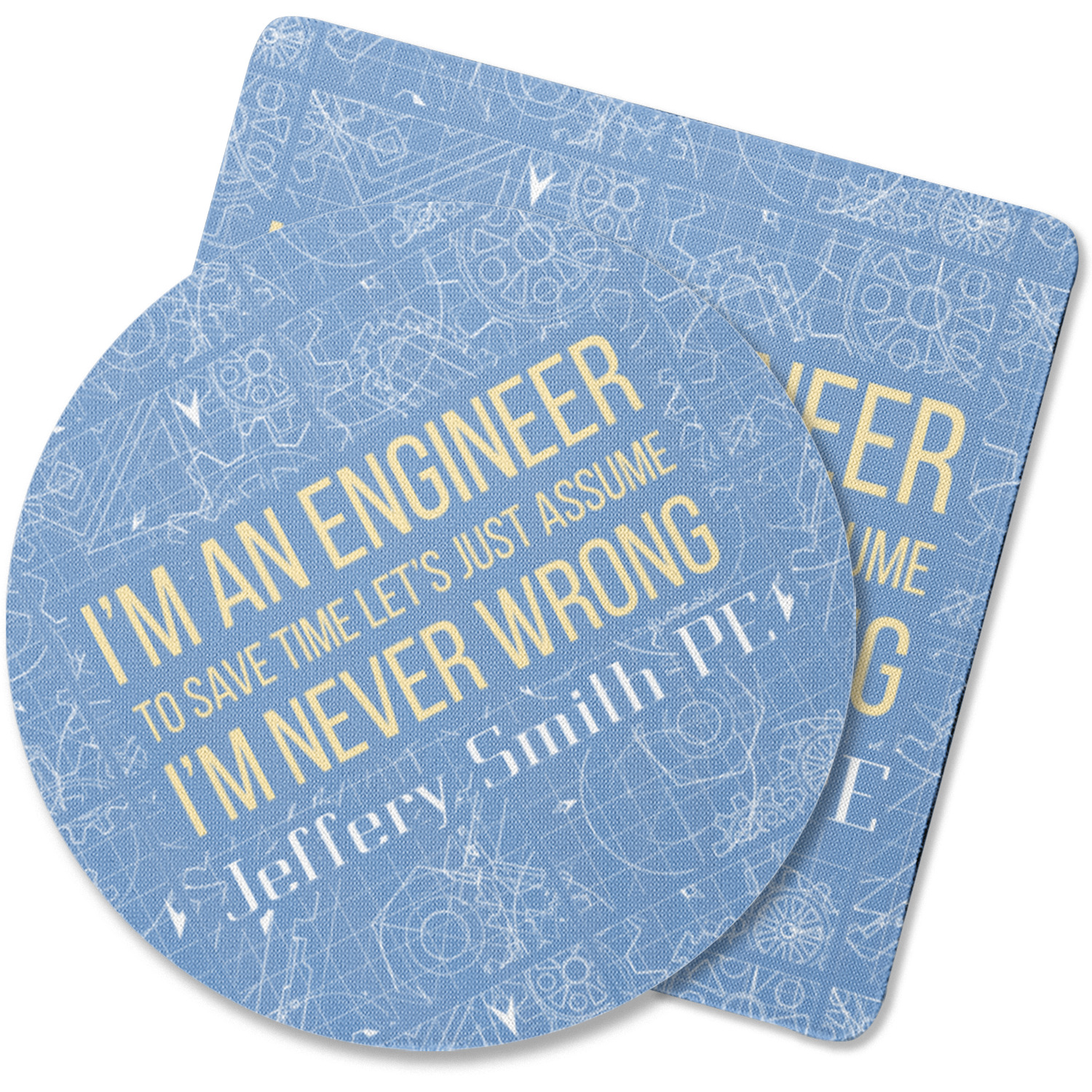 The main focus of this design is a funny quote that says "I'm an engineer, to save time let's just assume I'm never wrong." This will be sure to get anyone to crack a smile. The background is a blueprint pattern with gears and other shapes. The main colors are blue and light yellow. Your personalization goes directly under the quote.