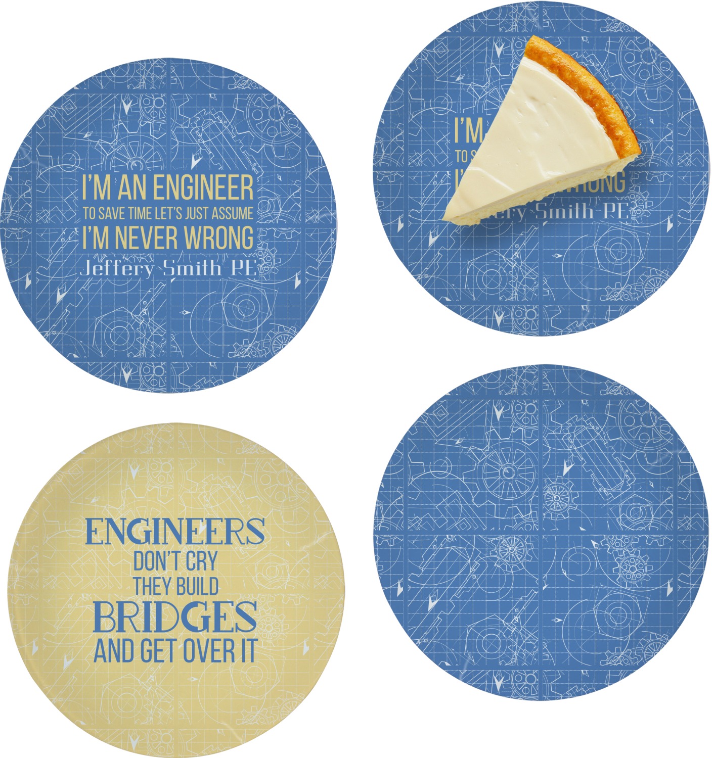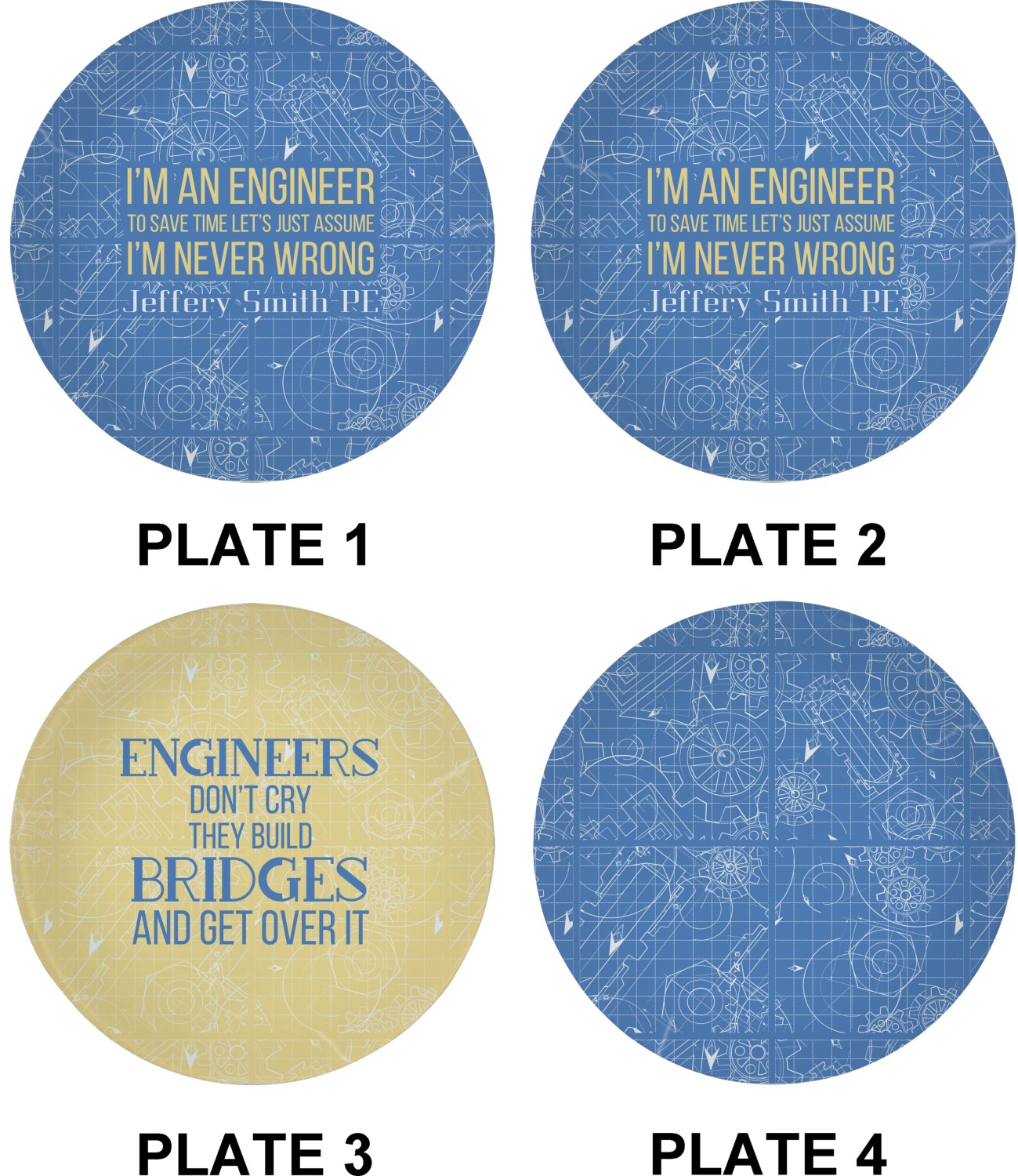 The main focus of this design is a funny quote that says "I'm an engineer, to save time let's just assume I'm never wrong." This will be sure to get anyone to crack a smile. The background is a blueprint pattern with gears and other shapes. The main colors are blue and light yellow. Your personalization goes directly under the quote.