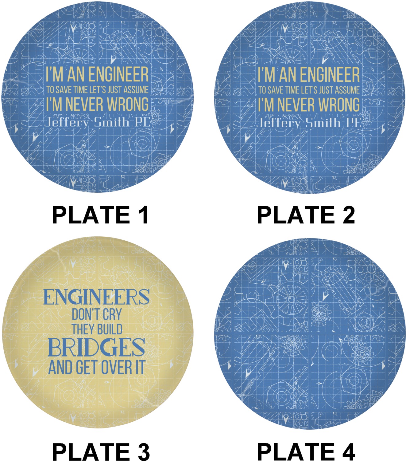 The main focus of this design is a funny quote that says "I'm an engineer, to save time let's just assume I'm never wrong." This will be sure to get anyone to crack a smile. The background is a blueprint pattern with gears and other shapes. The main colors are blue and light yellow. Your personalization goes directly under the quote.