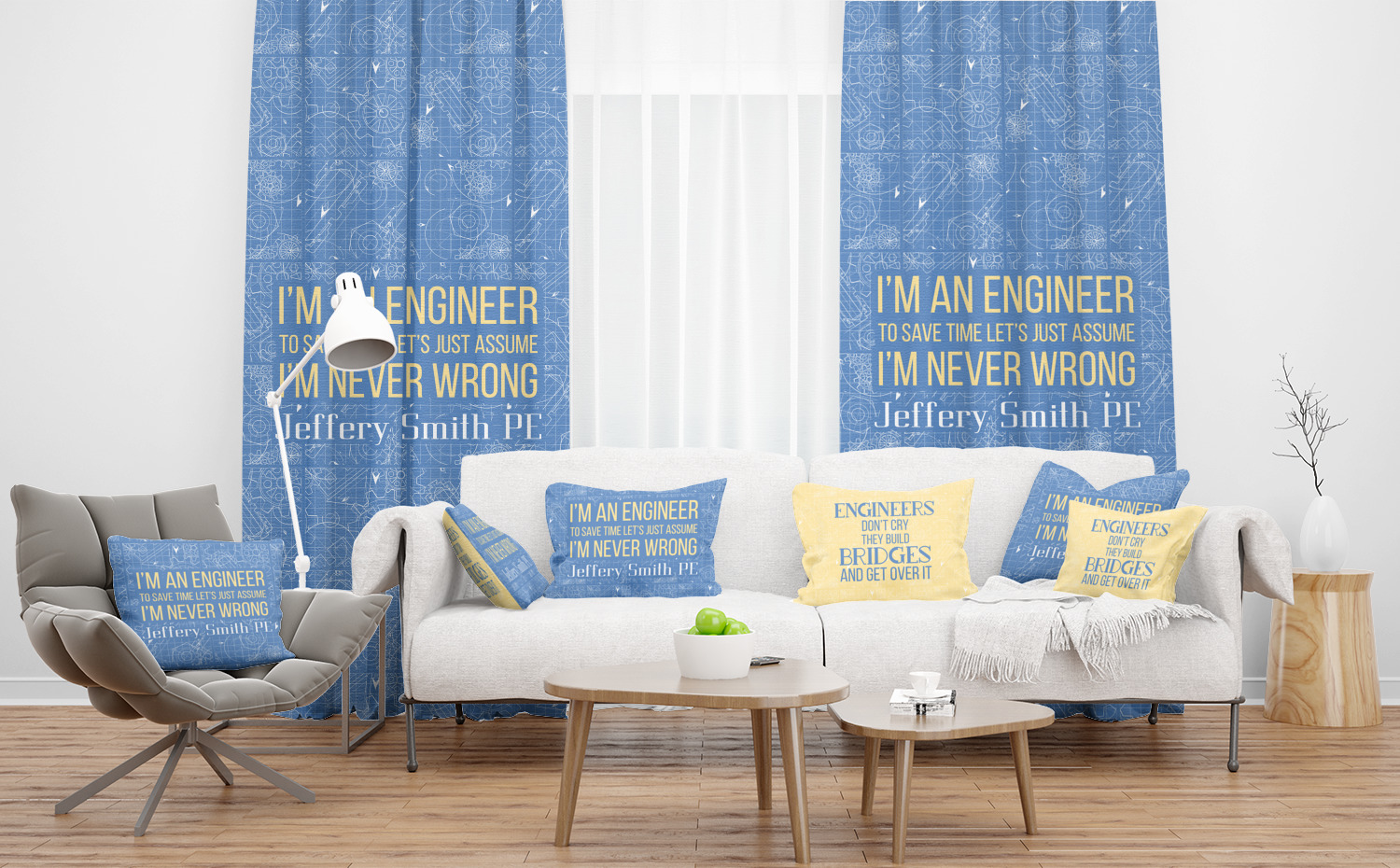 The main focus of this design is a funny quote that says "I'm an engineer, to save time let's just assume I'm never wrong." This will be sure to get anyone to crack a smile. The background is a blueprint pattern with gears and other shapes. The main colors are blue and light yellow. Your personalization goes directly under the quote.