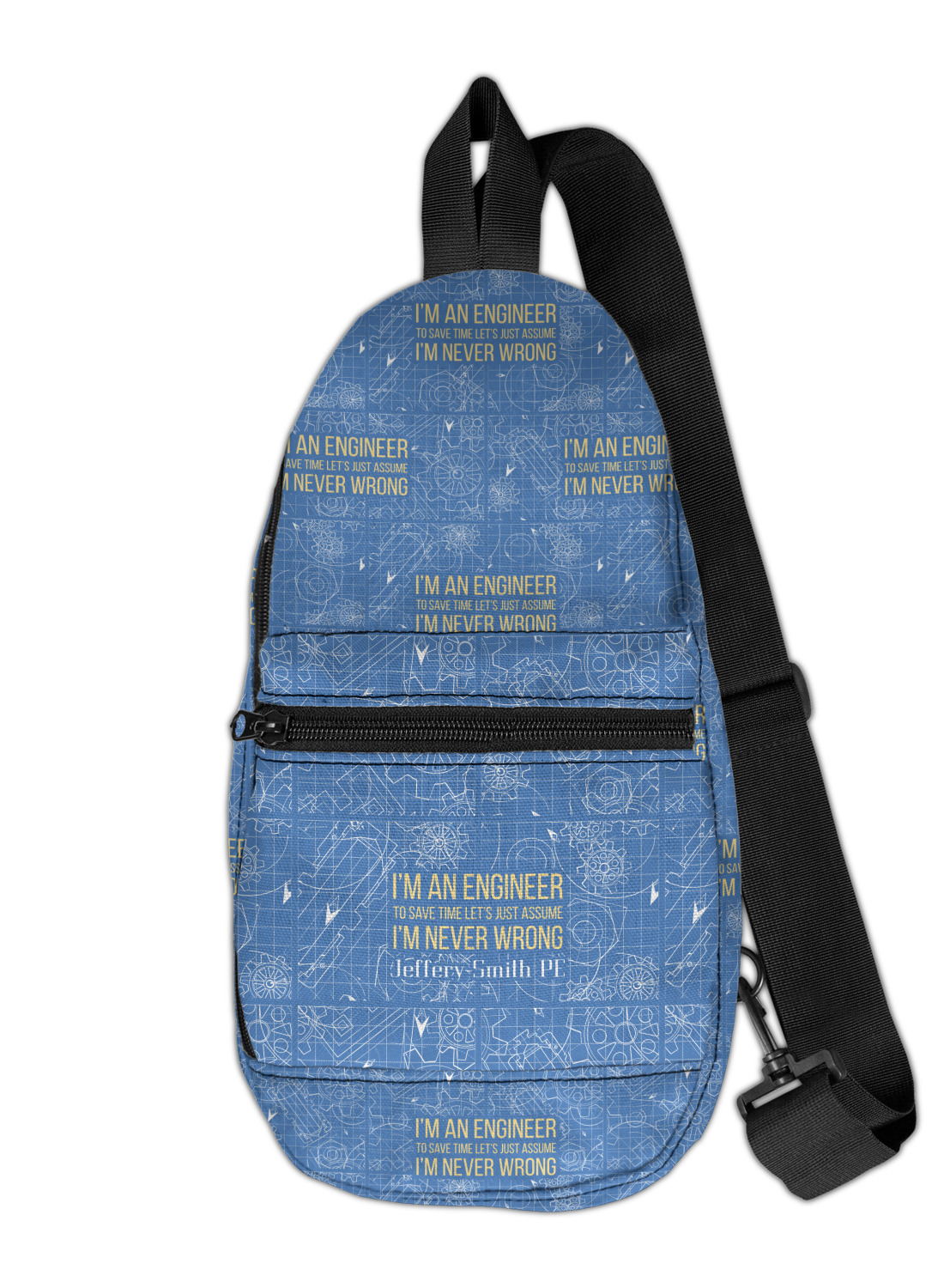 The main focus of this design is a funny quote that says "I'm an engineer, to save time let's just assume I'm never wrong." This will be sure to get anyone to crack a smile. The background is a blueprint pattern with gears and other shapes. The main colors are blue and light yellow. Your personalization goes directly under the quote.
