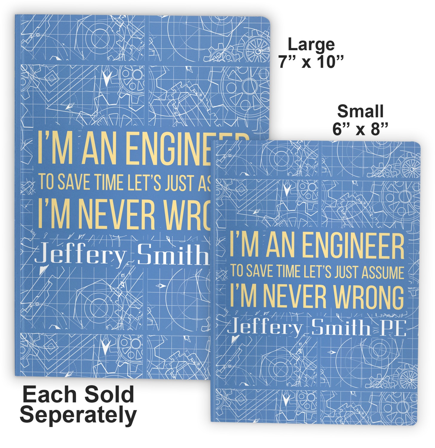 The main focus of this design is a funny quote that says "I'm an engineer, to save time let's just assume I'm never wrong." This will be sure to get anyone to crack a smile. The background is a blueprint pattern with gears and other shapes. The main colors are blue and light yellow. Your personalization goes directly under the quote.
