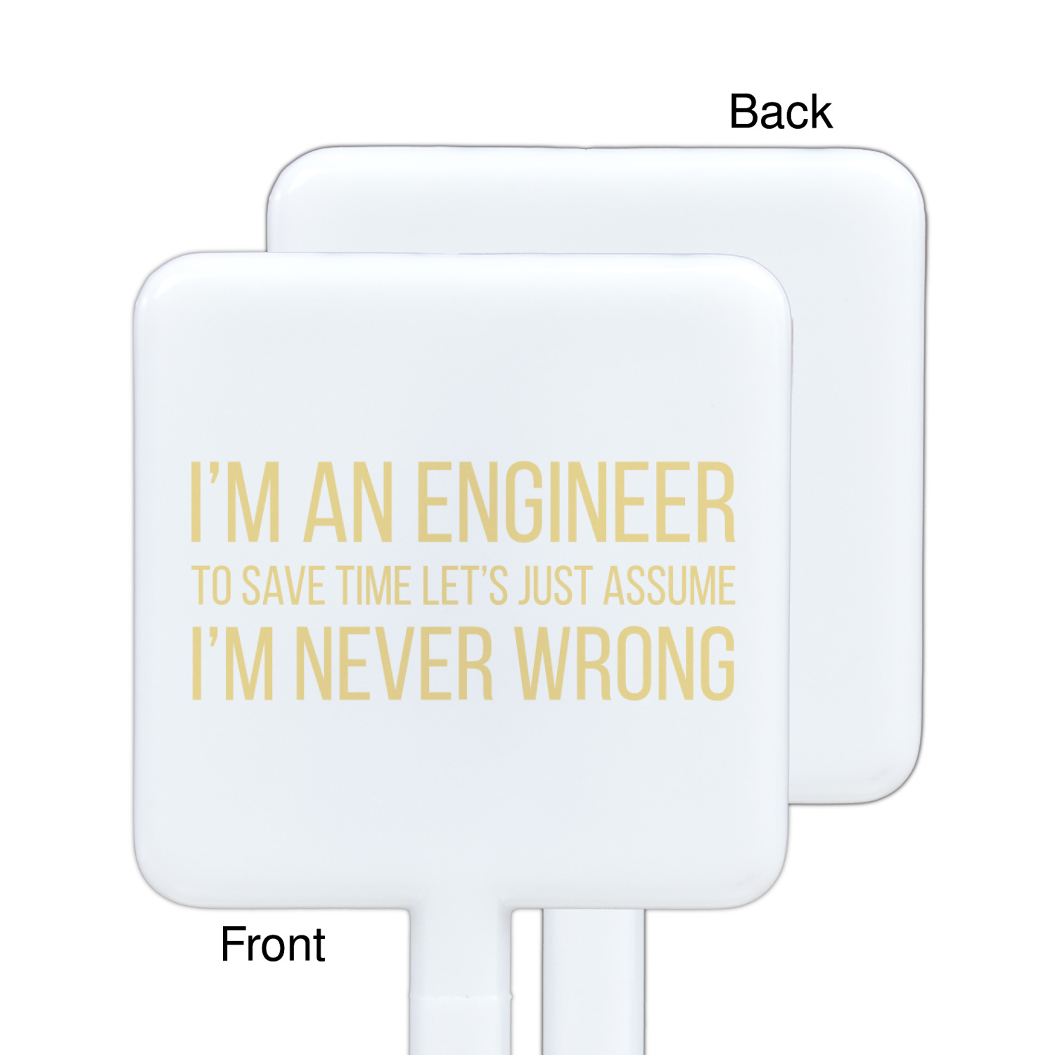 The main focus of this design is a funny quote that says "I'm an engineer, to save time let's just assume I'm never wrong." This will be sure to get anyone to crack a smile. The background is a blueprint pattern with gears and other shapes. The main colors are blue and light yellow. Your personalization goes directly under the quote.